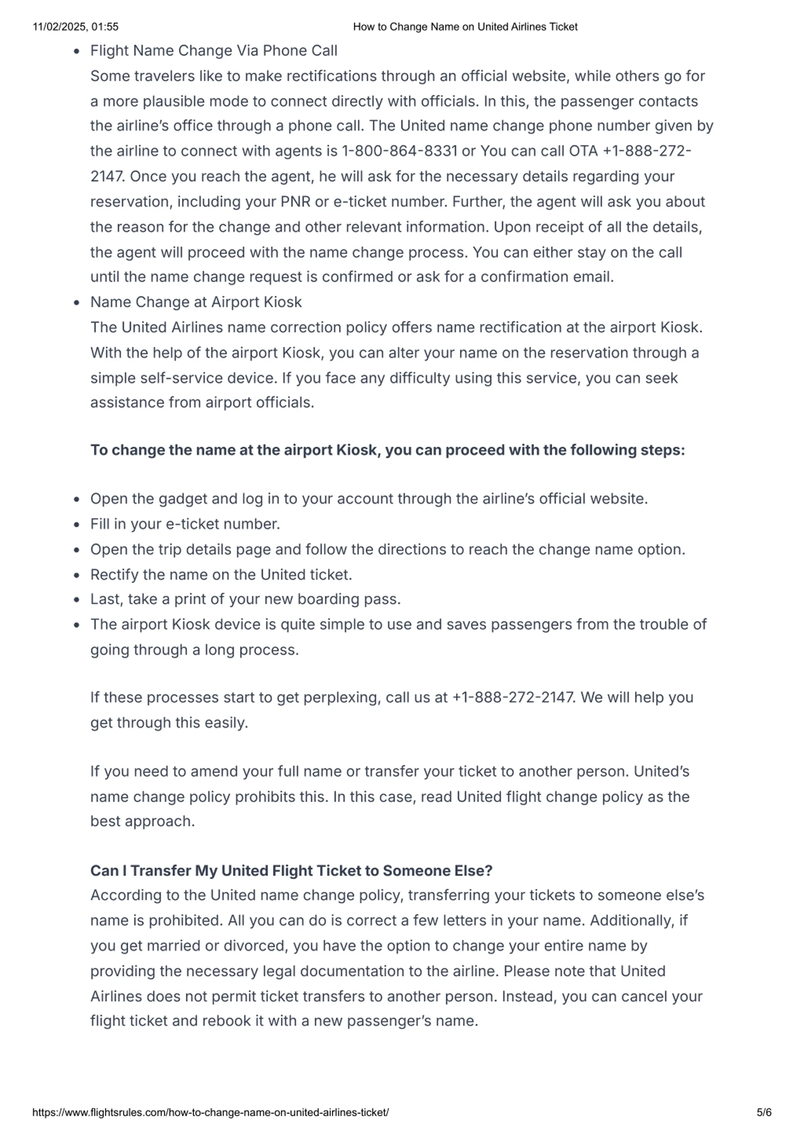 11/02/2025, 01:55 How to Change Name on United Airlines Ticket FlightNameChangeViaPhoneCall Sometravelersliketomakerectificationsthroughanofficialwebsite, whileothersgofor amoreplausiblemodetoconnectdirectlywithofficials. Inthis, thepassengercontacts theairline sofficethroughaphonecall. TheUnitednamechangephonenumbergivenby theairlinetoconnectwithagentsis 1?800?864?8331 orYoucancallOTA +1?888?272? 2147. Onceyoureachtheagent, hewillaskforthenecessarydetailsregardingyour reservation, includingyourPNRore-ticketnumber. Further, theagentwillaskyouabout thereasonforthechangeandotherrelevantinformation. Uponreceiptofallthedetails, theagentwillproceedwiththenamechangeprocess. Youcaneitherstayonthecall untilthenamechangerequestisconfirmedoraskforaconfirmationemail. NameChangeatAirportKiosk TheUnitedAirlinesnamecorrectionpolicyoffersnamerectificationattheairportKiosk. WiththehelpoftheairportKiosk, youcanalteryournameonthereservationthrougha simpleself-servicedevice. Ifyoufaceanydifficultyusingthisservice, youcanseek assistancefromairportofficials. TochangethenameattheairportKiosk, youcanproceedwiththefollowingsteps: Openthegadgetandlogintoyouraccountthroughtheairline sofficialwebsite. Fillinyoure-ticketnumber. Openthetripdetailspageandfollowthedirectionstoreachthechangenameoption. RectifythenameontheUnitedticket. Last, takeaprintofyournewboardingpass. TheairportKioskdeviceisquitesimpletouseandsavespassengersfromthetroubleof goingthroughalongprocess. Iftheseprocessesstarttogetperplexing, callusat +1?888?272?2147. Wewillhelpyou getthroughthiseasily. Ifyouneedtoamendyourfullnameortransferyourtickettoanotherperson. United s namechangepolicyprohibitsthis. Inthiscase, readUnitedflightchangepolicyasthe bestapproach. CanITransferMyUnitedFlightTickettoSomeoneElse? AccordingtotheUnitednamechangepolicy, transferringyourticketstosomeoneelse s nameisprohibited. Allyoucandoiscorrectafewlettersinyourname. Additionally, if yougetmarriedordivorced, youhavetheoptiontochangeyourentirenameby providingthenecessarylegaldocumentationtotheairline. PleasenotethatUnited Airlinesdoesnotpermittickettransferstoanotherperson. Instead, youcancancelyour flightticketandrebookitwithanewpassenger sname. https://www.flightsrules.com/how-to-change-name-on-united-airlines-ticket/ 5/6