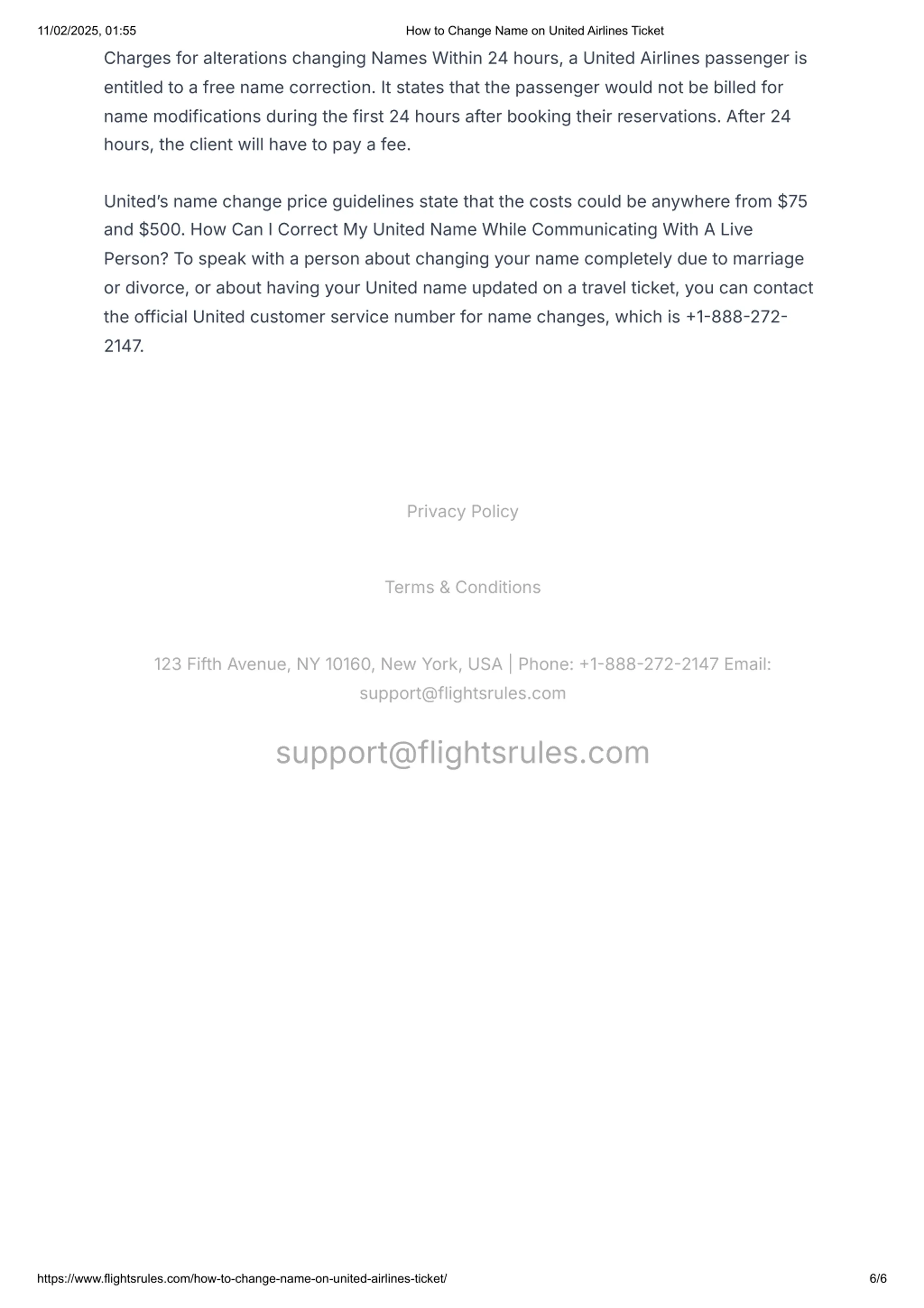 11/02/2025, 01:55 How to Change Name on United Airlines Ticket ChargesforalterationschangingNamesWithin 24 hours, aUnitedAirlinespassengeris entitledtoafreenamecorrection. Itstatesthatthepassengerwouldnotbebilledfor namemodificationsduringthefirst 24 hoursafterbookingtheirreservations. After 24 hours, theclientwillhavetopayafee. United snamechangepriceguidelinesstatethatthecostscouldbeanywherefrom$75 and$500. HowCanICorrectMyUnitedNameWhileCommunicatingWithALive Person? Tospeakwithapersonaboutchangingyournamecompletelyduetomarriage ordivorce, orabouthavingyourUnitednameupdatedonatravelticket, youcancontact theofficialUnitedcustomerservicenumberfornamechanges, whichis +1?888?272? 2147. PrivacyPolicy Terms & Conditions 123 FifthAvenue, NY 10160, NewYork, USA | Phone: +1?888?272?2147 Email: support@flightsrules.com support@flightsrules.com https://www.flightsrules.com/how-to-change-name-on-united-airlines-ticket/ 6/6
