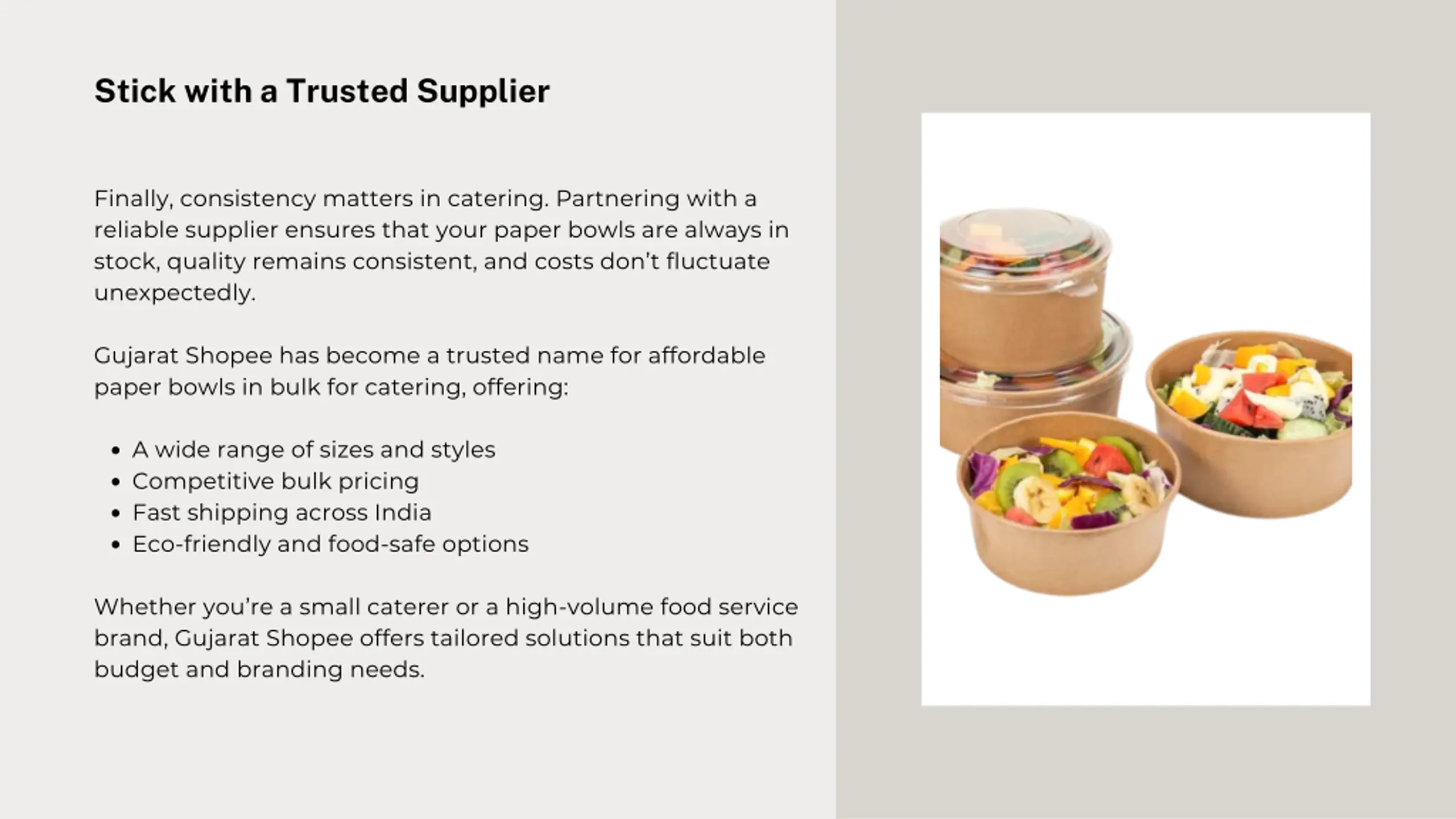 Stick with a Trusted Supplier Finally, consistency matters in catering. Partnering with a reliable supplier ensures that your paper bowls are always in stock, quality remains consistent, and costs don t fluctuate unexpectedly. Gujarat Shopee has become a trusted name for affordable paper bowls in bulk for catering, offering: A wide range of sizes and styles Competitive bulk pricing Fast shipping across India Eco-friendly and food-safe options Whether you re a small caterer or a high-volume food service brand, Gujarat Shopee offers tailored solutions that suit both budget and branding needs.