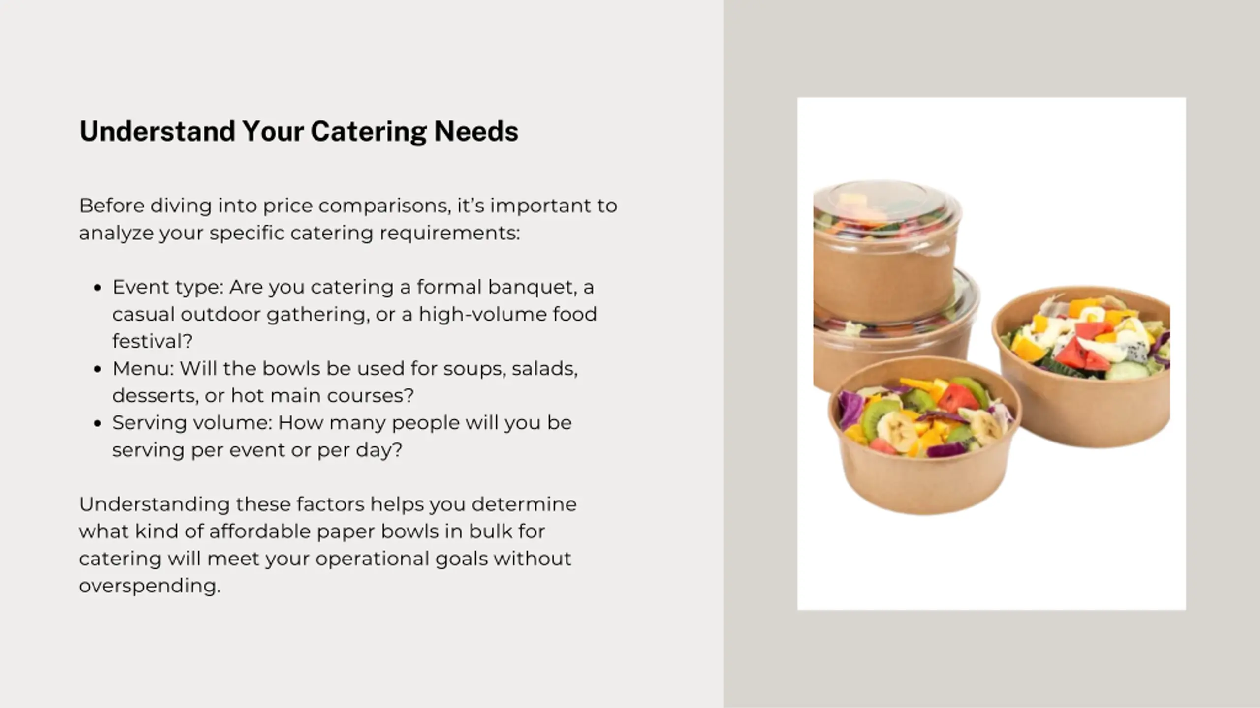 Understand Your Catering Needs Before diving into price comparisons, it s important to analyze your specific catering requirements: Event type: Are you catering a formal banquet, a casual outdoor gathering, or a high-volume food festival? Menu: Will the bowls be used for soups, salads, desserts, or hot main courses? Serving volume: How many people will you be serving per event or per day? Understanding these factors helps you determine what kind of affordable paper bowls in bulk for catering will meet your operational goals without overspending.