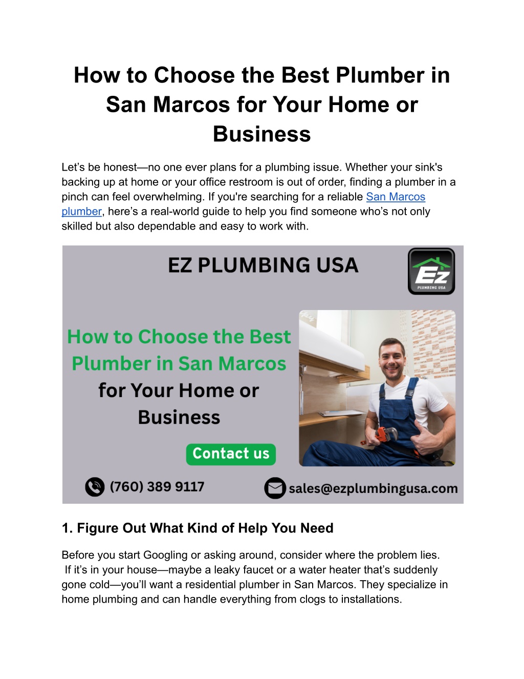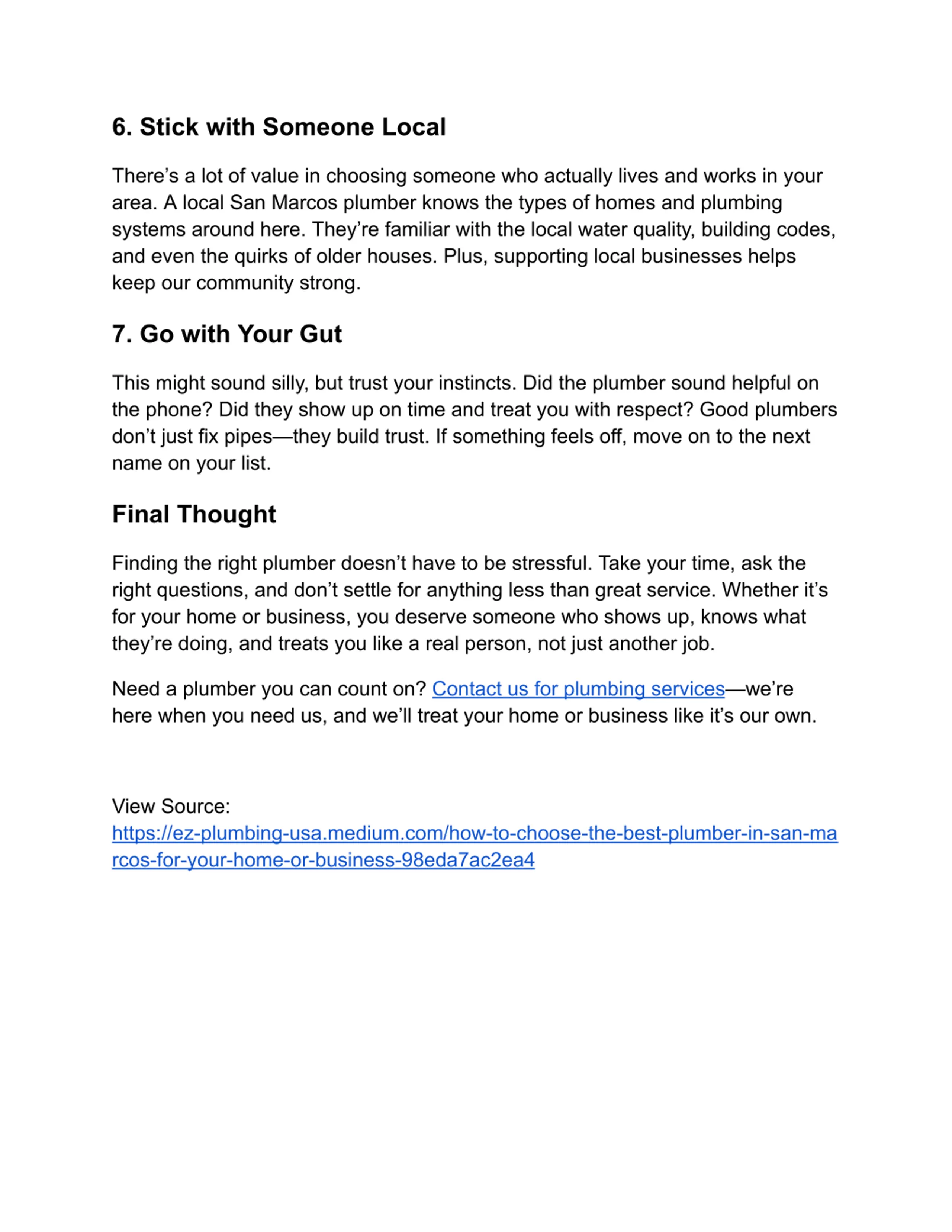 6. Stick with Someone Local There s a lot of value in choosing someone who actually lives and works in your area. A local San Marcos plumber knows the types of homes and plumbing systems around here. They re familiar with the local water quality, building codes, and even the quirks of older houses. Plus, supporting local businesses helps keep our community strong. 7. Go with Your Gut This might sound silly, but trust your instincts. Did the plumber sound helpful on the phone? Did they show up on time and treat you with respect? Good plumbers don t just fix pipes they build trust. If something feels off, move on to the next name on your list. Final Thought Finding the right plumber doesn t have to be stressful. Take your time, ask the right questions, and don t settle for anything less than great service. Whether it s for your home or business, you deserve someone who shows up, knows what they re doing, and treats you like a real person, not just another job. Need a plumber you can count on? Contact us for plumbing services we re here when you need us, and we ll treat your home or business like it s our own. View Source: https://ez-plumbing-usa.medium.com/how-to-choose-the-best-plumber-in-san-ma rcos-for-your-home-or-business-98eda7ac2ea4