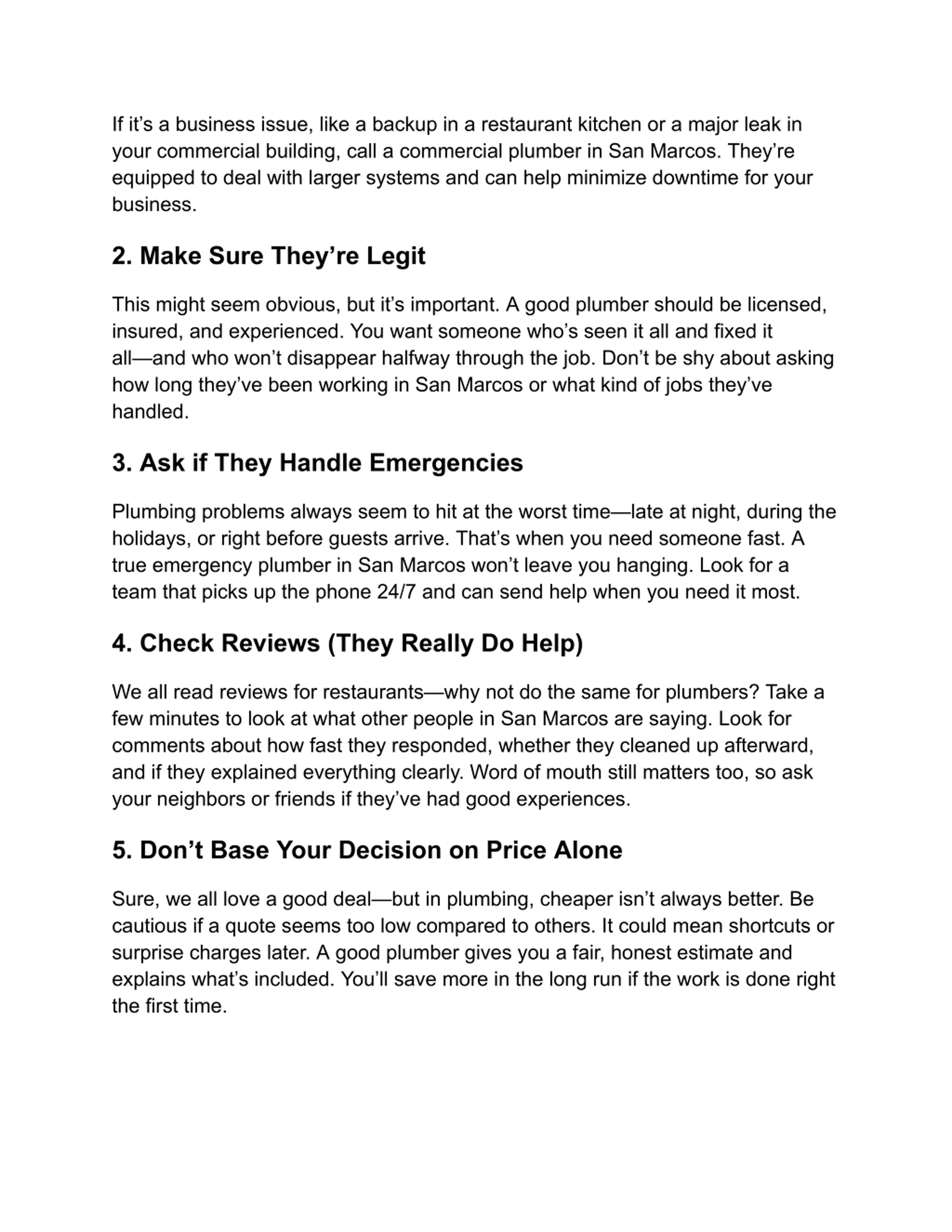 If its a business issue, like a backup in a restaurant kitchen or a major leak in your commercial building, call a commercial plumber in San Marcos. They re equipped to deal with larger systems and can help minimize downtime for your business. 2. Make Sure They re Legit This might seem obvious, but it s important. A good plumber should be licensed, insured, and experienced. You want someone who s seen it all and fixed it all and who won t disappear halfway through the job. Don t be shy about asking how long they ve been working in San Marcos or what kind of jobs they ve handled. 3. Ask if They Handle Emergencies Plumbing problems always seem to hit at the worst time late at night, during the holidays, or right before guests arrive. That s when you need someone fast. A true emergency plumber in San Marcos won t leave you hanging. Look for a team that picks up the phone 24/7 and can send help when you need it most. 4. Check Reviews (They Really Do Help) We all read reviews for restaurants why not do the same for plumbers? Take a few minutes to look at what other people in San Marcos are saying. Look for comments about how fast they responded, whether they cleaned up afterward, and if they explained everything clearly. Word of mouth still matters too, so ask your neighbors or friends if they ve had good experiences. 5. Don t Base Your Decision on Price Alone Sure, we all love a good deal but in plumbing, cheaper isn t always better. Be cautious if a quote seems too low compared to others. It could mean shortcuts or surprise charges later. A good plumber gives you a fair, honest estimate and explains what s included. You ll save more in the long run if the work is done right the first time.