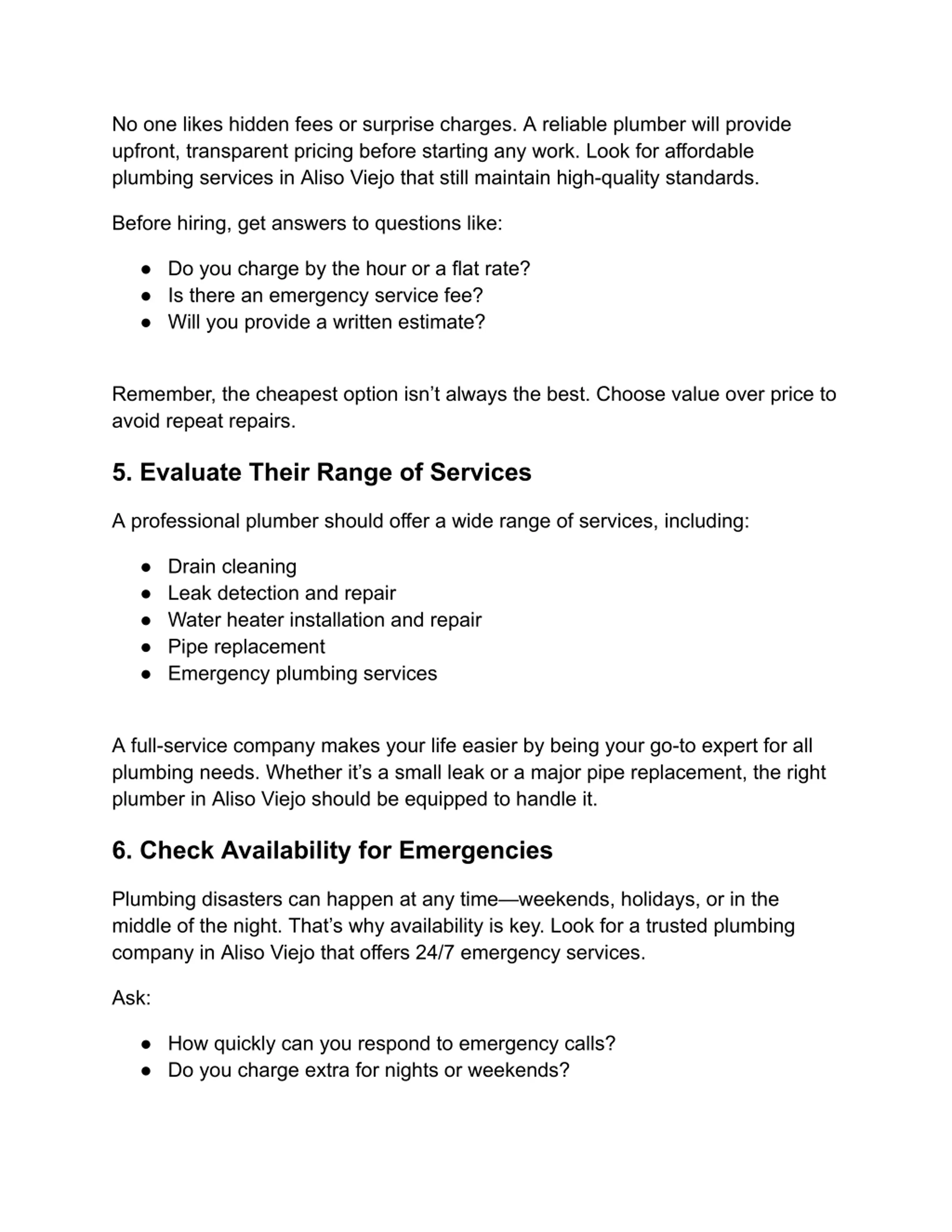 No one likes hidden fees or surprise charges. A reliable plumber will provide upfront, transparent pricing before starting any work. Look for affordable plumbing services in Aliso Viejo that still maintain high-quality standards. Before hiring, get answers to questions like: Do you charge by the hour or a flat rate? Is there an emergency service fee? Will you provide a written estimate? Remember, the cheapest option isn t always the best. Choose value over price to avoid repeat repairs. 5. Evaluate Their Range of Services A professional plumber should offer a wide range of services, including: Drain cleaning Leak detection and repair Water heater installation and repair Pipe replacement Emergency plumbing services A full-service company makes your life easier by being your go-to expert for all plumbing needs. Whether it s a small leak or a major pipe replacement, the right plumber in Aliso Viejo should be equipped to handle it. 6. Check Availability for Emergencies Plumbing disasters can happen at any time weekends, holidays, or in the middle of the night. That s why availability is key. Look for a trusted plumbing company in Aliso Viejo that offers 24/7 emergency services. Ask: How quickly can you respond to emergency calls? Do you charge extra for nights or weekends?