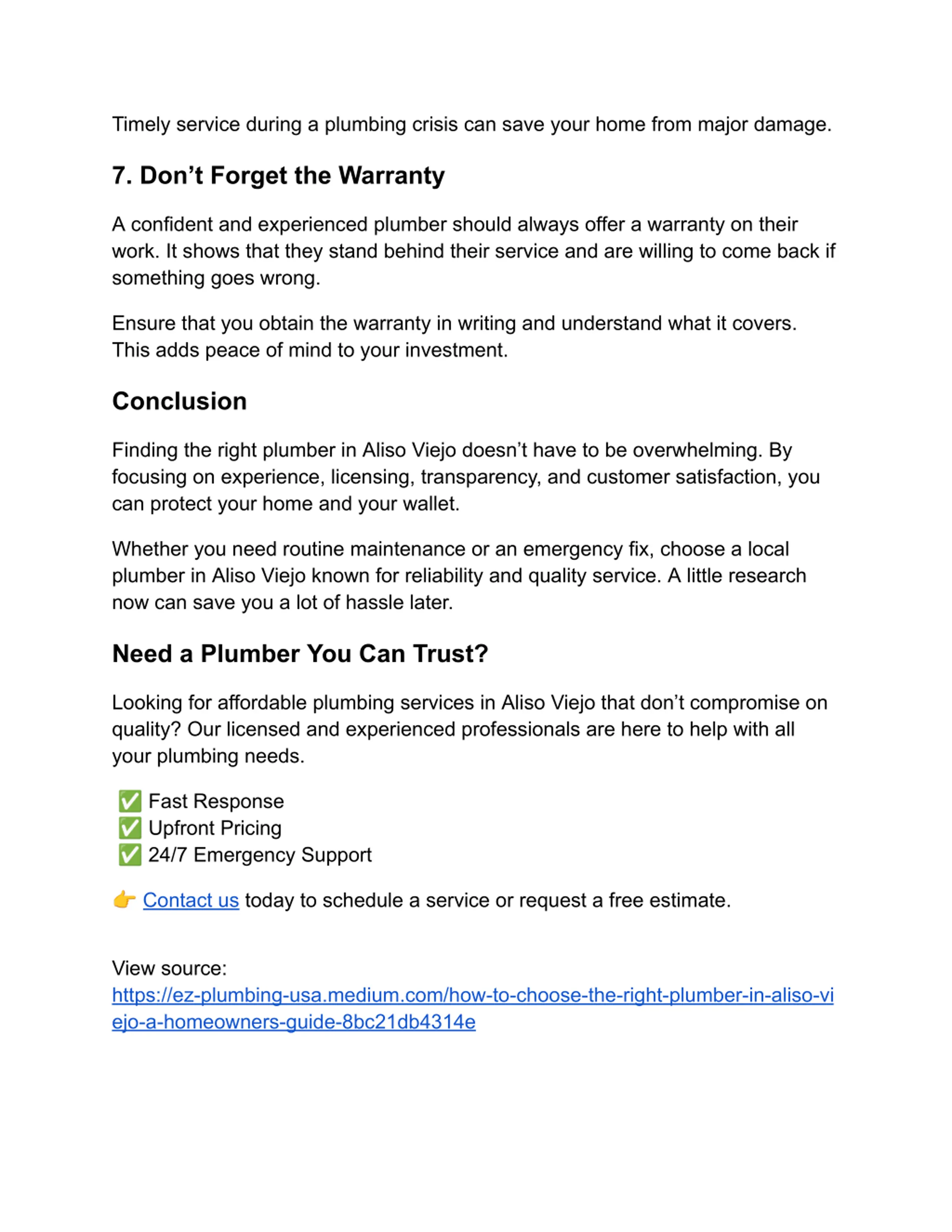 Timely service during a plumbing crisis can save your home from major damage. 7. Don t Forget the Warranty A confident and experienced plumber should always offer a warranty on their work. It shows that they stand behind their service and are willing to come back if something goes wrong. Ensure that you obtain the warranty in writing and understand what it covers. This adds peace of mind to your investment. Conclusion Finding the right plumber in Aliso Viejo doesn t have to be overwhelming. By focusing on experience, licensing, transparency, and customer satisfaction, you can protect your home and your wallet. Whether you need routine maintenance or an emergency fix, choose a local plumber in Aliso Viejo known for reliability and quality service. A little research now can save you a lot of hassle later. Need a Plumber You Can Trust? Looking for affordable plumbing services in Aliso Viejo that don t compromise on quality? Our licensed and experienced professionals are here to help with all your plumbing needs. Fast Response Upfront Pricing 24/7 Emergency Support ?Contact us today to schedule a service or request a free estimate. View source: https://ez-plumbing-usa.medium.com/how-to-choose-the-right-plumber-in-aliso-vi ejo-a-homeowners-guide-8bc21db4314e
