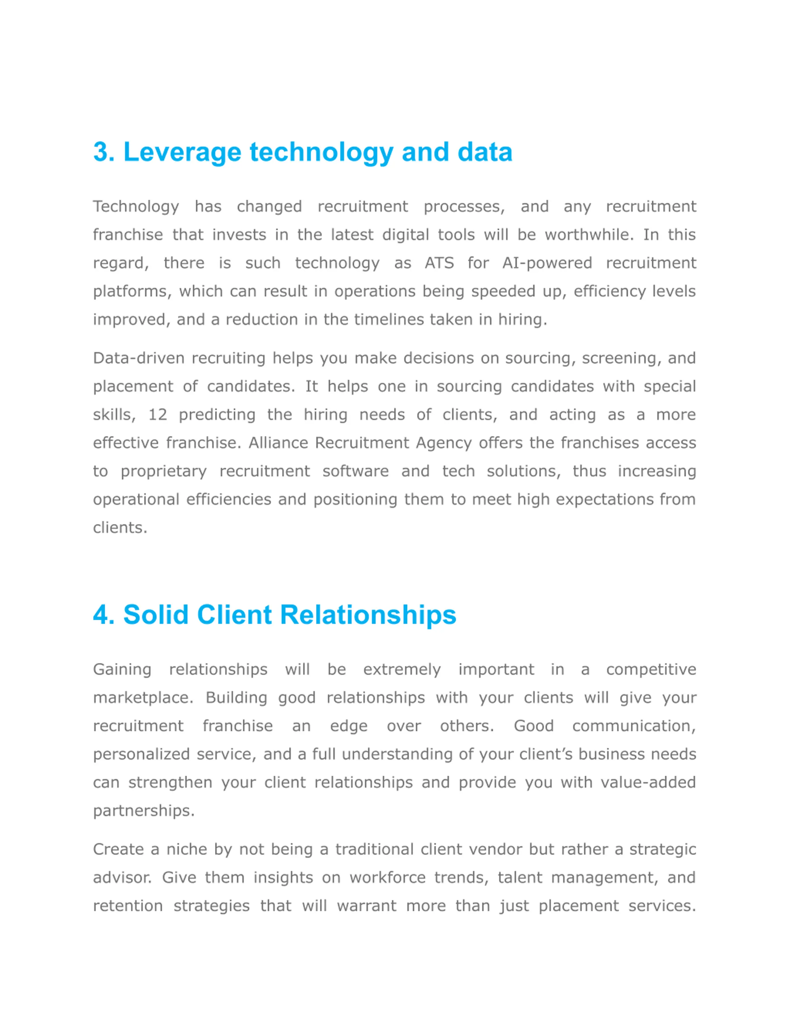3. Leverage technology and data Technology has changed recruitment processes, and any recruitment franchise that invests in the latest digital tools will be worthwhile. In this regard, there is such technology as ATS for AI-powered recruitment platforms, which can result in operations being speeded up, efficiency levels improved, and a reduction in the timelines taken in hiring. Data-driven recruiting helps you make decisions on sourcing, screening, and placement of candidates. It helps one in sourcing candidates with special skills, 12 predicting the hiring needs of clients, and acting as a more effective franchise. Alliance Recruitment Agency offers the franchises access to proprietary recruitment software and tech solutions, thus increasing operational efficiencies and positioning them to meet high expectations from clients. 4. Solid Client Relationships Gaining relationships will be extremely important in a competitive marketplace. Building good relationships with your clients will give your recruitment franchise an edge over others. Good communication, personalized service, and a full understanding of your client s business needs can strengthen your client relationships and provide you with value-added partnerships. Create a niche by not being a traditional client vendor but rather a strategic advisor. Give them insights on workforce trends, talent management, and retention strategies that will warrant more than just placement services.