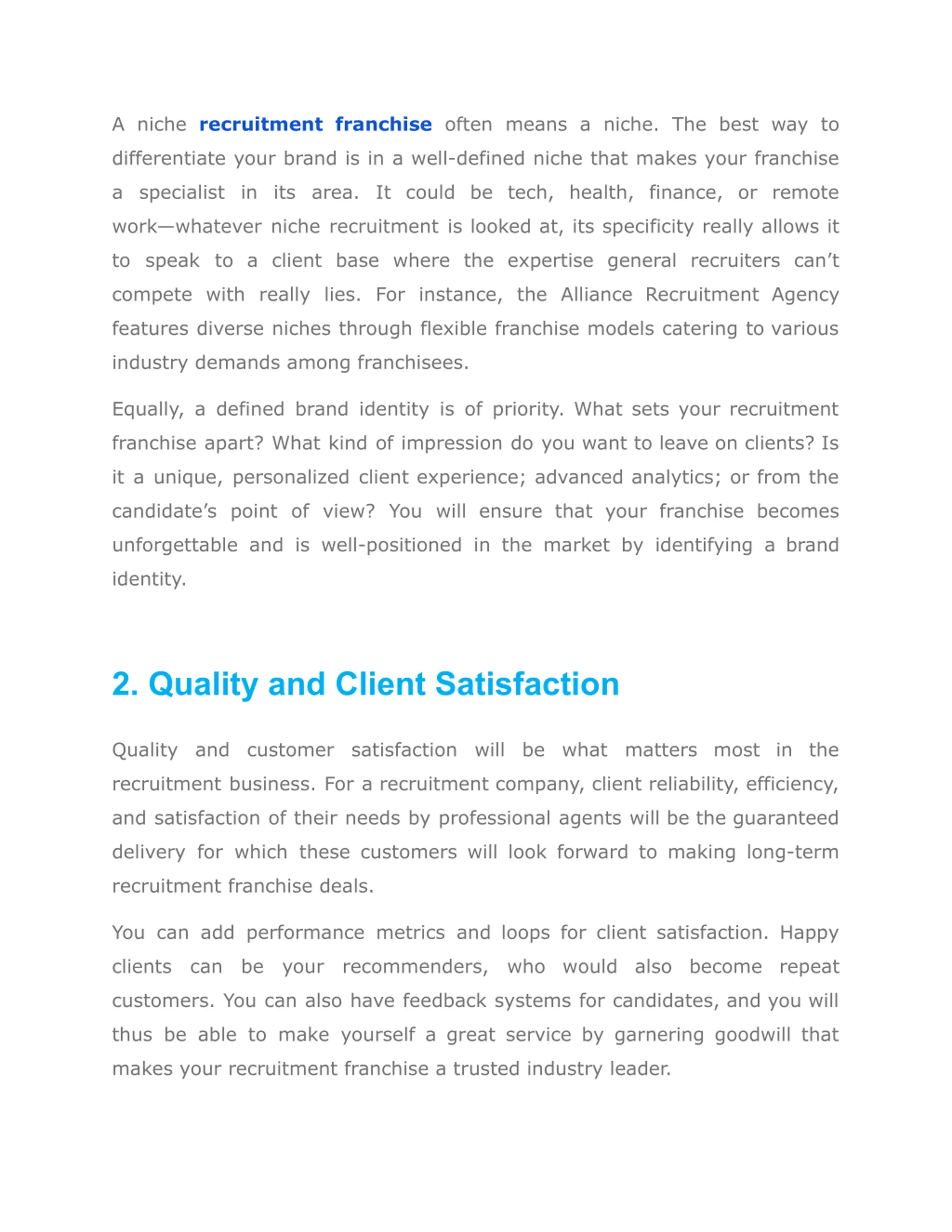 A niche recruitment franchise often means a niche. The best way to differentiate your brand is in a well-defined niche that makes your franchise a specialist in its area. It could be tech, health, finance, or remote work whatever niche recruitment is looked at, its specificity really allows it to speak to a client base where the expertise general recruiters can t compete with really lies. For instance, the Alliance Recruitment Agency features diverse niches through flexible franchise models catering to various industry demands among franchisees. Equally, a defined brand identity is of priority. What sets your recruitment franchise apart? What kind of impression do you want to leave on clients? Is it a unique, personalized client experience; advanced analytics; or from the candidate s point of view? You will ensure that your franchise becomes unforgettable and is well-positioned in the market by identifying a brand identity. 2. Quality and Client Satisfaction Quality and customer satisfaction will be what matters most in the recruitment business. For a recruitment company, client reliability, efficiency, and satisfaction of their needs by professional agents will be the guaranteed delivery for which these customers will look forward to making long-term recruitment franchise deals. You can add performance metrics and loops for client satisfaction. Happy clients can be your recommenders, who would also become repeat customers. You can also have feedback systems for candidates, and you will thus be able to make yourself a great service by garnering goodwill that makes your recruitment franchise a trusted industry leader.