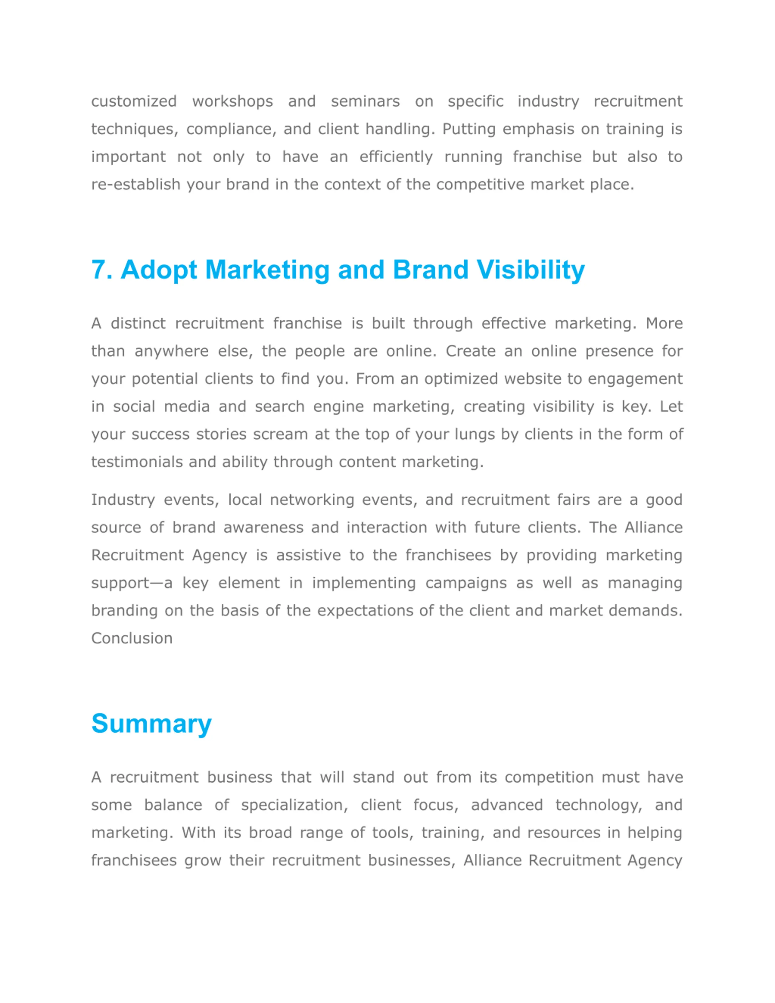 customized workshops and seminars on specific industry recruitment techniques, compliance, and client handling. Putting emphasis on training is important not only to have an efficiently running franchise but also to re-establish your brand in the context of the competitive market place. 7. Adopt Marketing and Brand Visibility A distinct recruitment franchise is built through effective marketing. More than anywhere else, the people are online. Create an online presence for your potential clients to find you. From an optimized website to engagement in social media and search engine marketing, creating visibility is key. Let your success stories scream at the top of your lungs by clients in the form of testimonials and ability through content marketing. Industry events, local networking events, and recruitment fairs are a good source of brand awareness and interaction with future clients. The Alliance Recruitment Agency is assistive to the franchisees by providing marketing support a key element in implementing campaigns as well as managing branding on the basis of the expectations of the client and market demands. Conclusion Summary A recruitment business that will stand out from its competition must have some balance of specialization, client focus, advanced technology, and marketing. With its broad range of tools, training, and resources in helping franchisees grow their recruitment businesses, Alliance Recruitment Agency