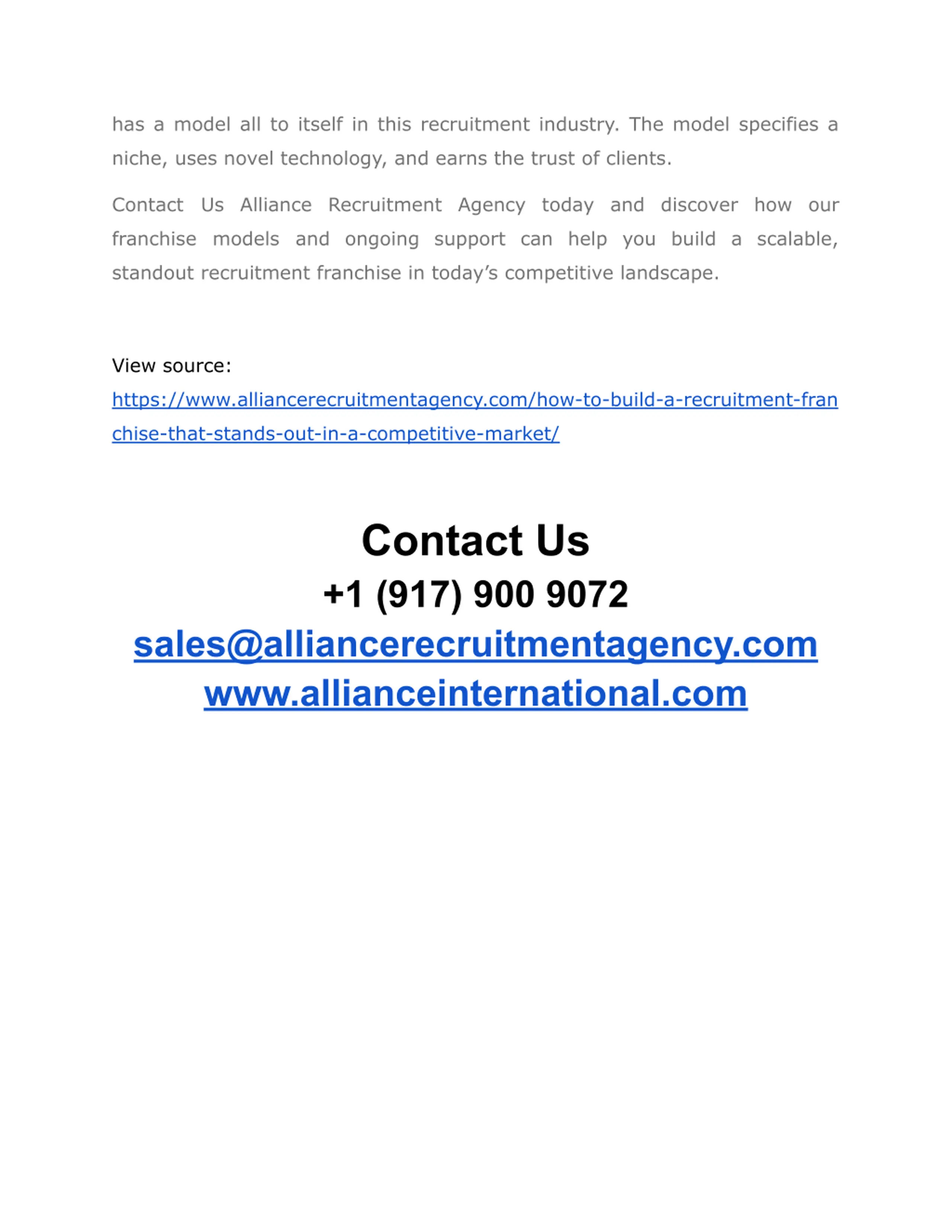 has a model all to itself in this recruitment industry. The model specifies a niche, uses novel technology, and earns the trust of clients. Contact Us Alliance Recruitment Agency today and discover how our franchise models and ongoing support can help you build a scalable, standout recruitment franchise in today s competitive landscape. View source: https://www.alliancerecruitmentagency.com/how-to-build-a-recruitment-fran chise-that-stands-out-in-a-competitive-market/ Contact Us +1 (917) 900 9072 sales@alliancerecruitmentagency.com www.allianceinternational.com