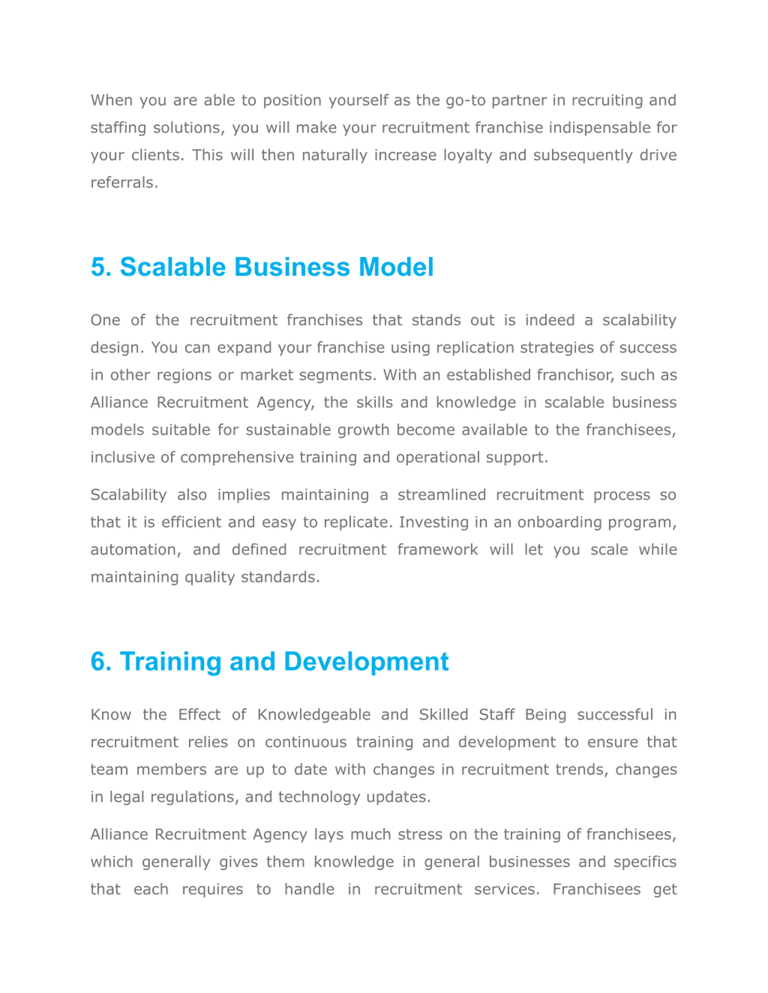 When you are able to position yourself as the go-to partner in recruiting and staffing solutions, you will make your recruitment franchise indispensable for your clients. This will then naturally increase loyalty and subsequently drive referrals. 5. Scalable Business Model One of the recruitment franchises that stands out is indeed a scalability design. You can expand your franchise using replication strategies of success in other regions or market segments. With an established franchisor, such as Alliance Recruitment Agency, the skills and knowledge in scalable business models suitable for sustainable growth become available to the franchisees, inclusive of comprehensive training and operational support. Scalability also implies maintaining a streamlined recruitment process so that it is efficient and easy to replicate. Investing in an onboarding program, automation, and defined recruitment framework will let you scale while maintaining quality standards. 6. Training and Development Know the Effect of Knowledgeable and Skilled Staff Being successful in recruitment relies on continuous training and development to ensure that team members are up to date with changes in recruitment trends, changes in legal regulations, and technology updates. Alliance Recruitment Agency lays much stress on the training of franchisees, which generally gives them knowledge in general businesses and specifics that each requires to handle in recruitment services. Franchisees get