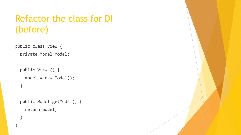 Refactor the class for DI (before) public class View { private Model model; public View () { model = new Model(); } public Model getModel() { return model; } }