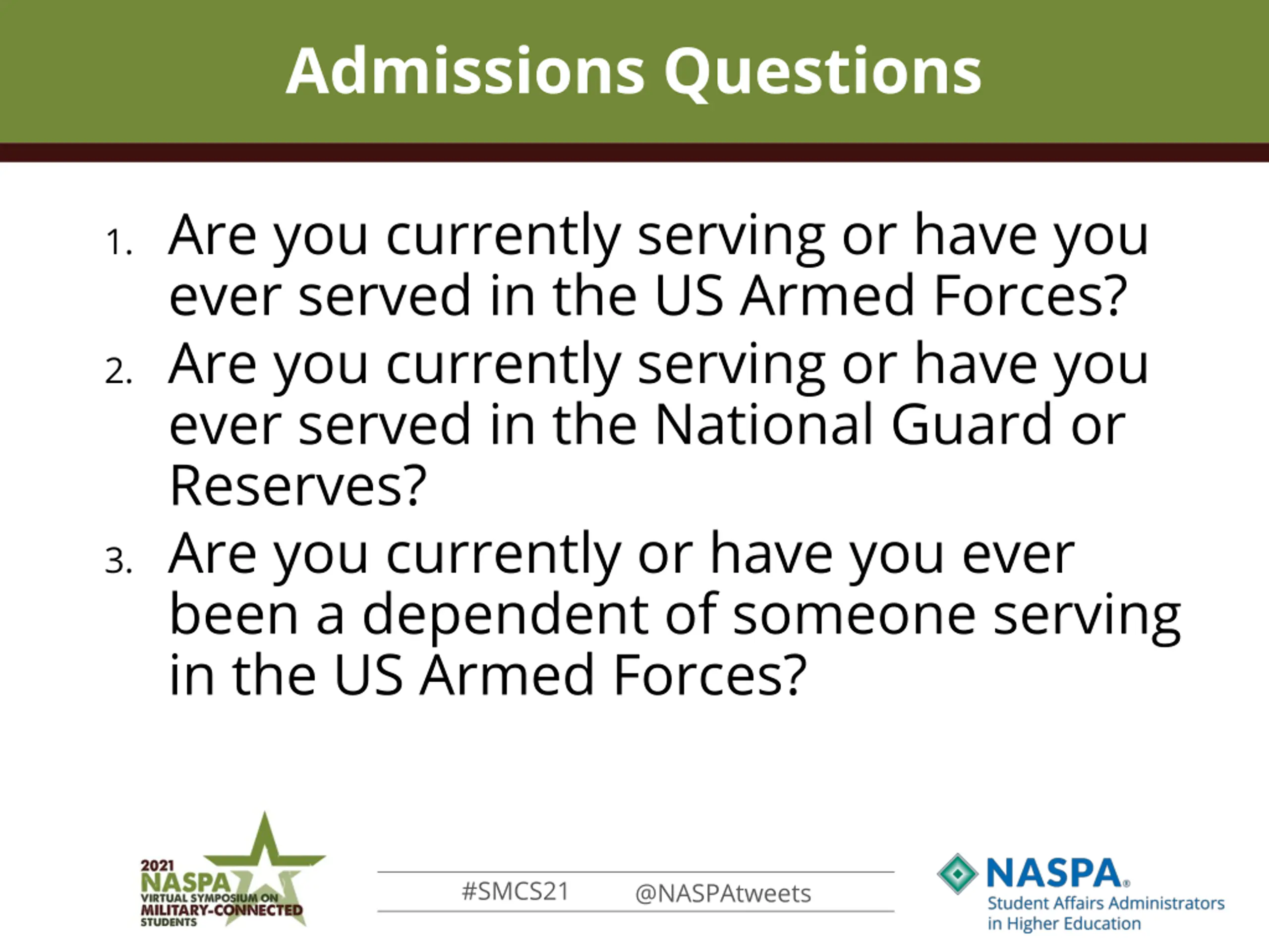 Admissions Questions 1. Are you currently serving or have you ever served in the US Armed Forces? 2. Are you currently serving or have you ever served in the National Guard or Reserves? 3. Are you currently or have you ever been a dependent of someone serving in the US Armed Forces? #SMCS21 @NASPAtweets