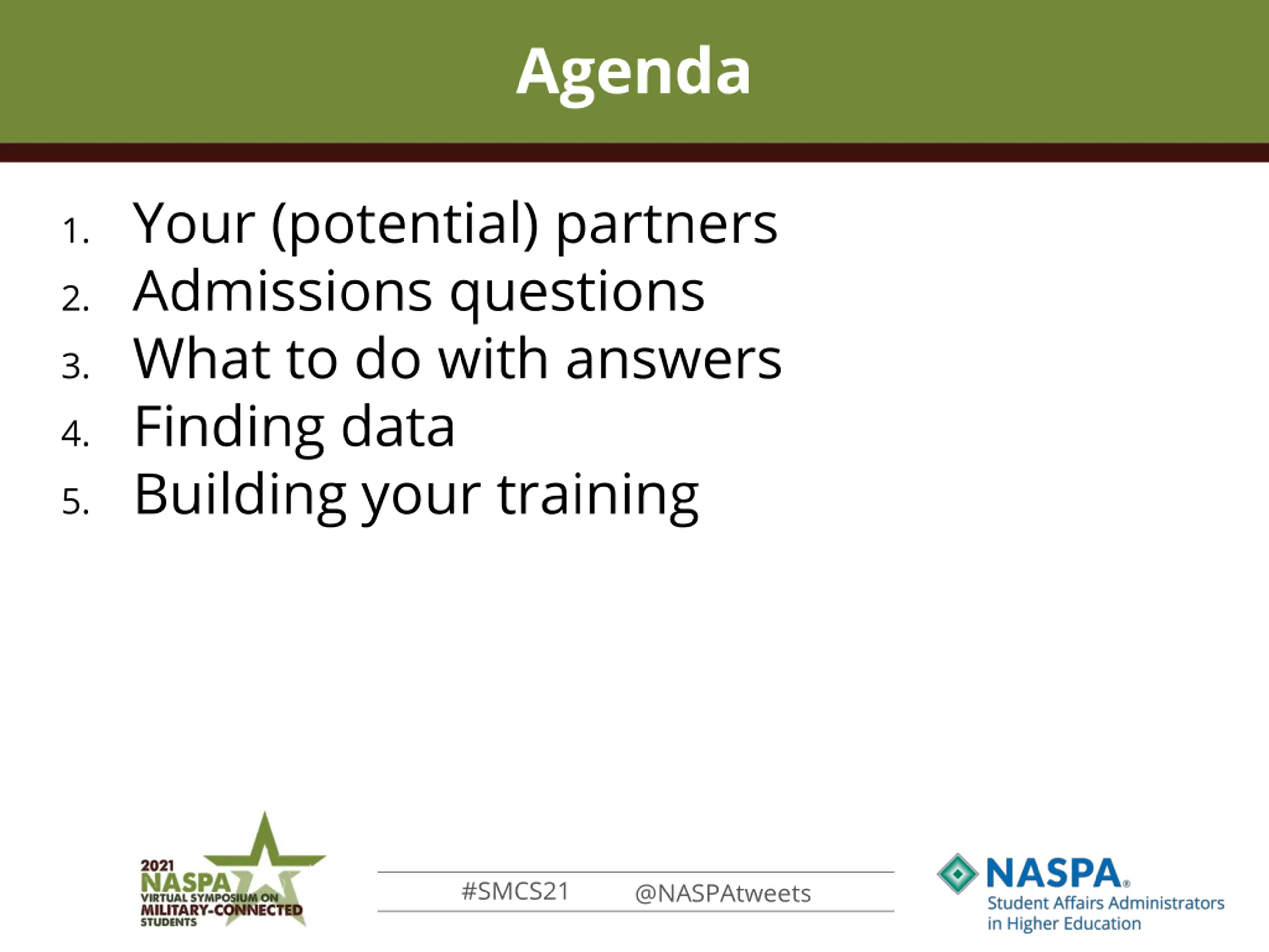 Agenda 1. Your (potential) partners 2. Admissions questions 3. What to do with answers 4. Finding data 5. Building your training #SMCS21 @NASPAtweets