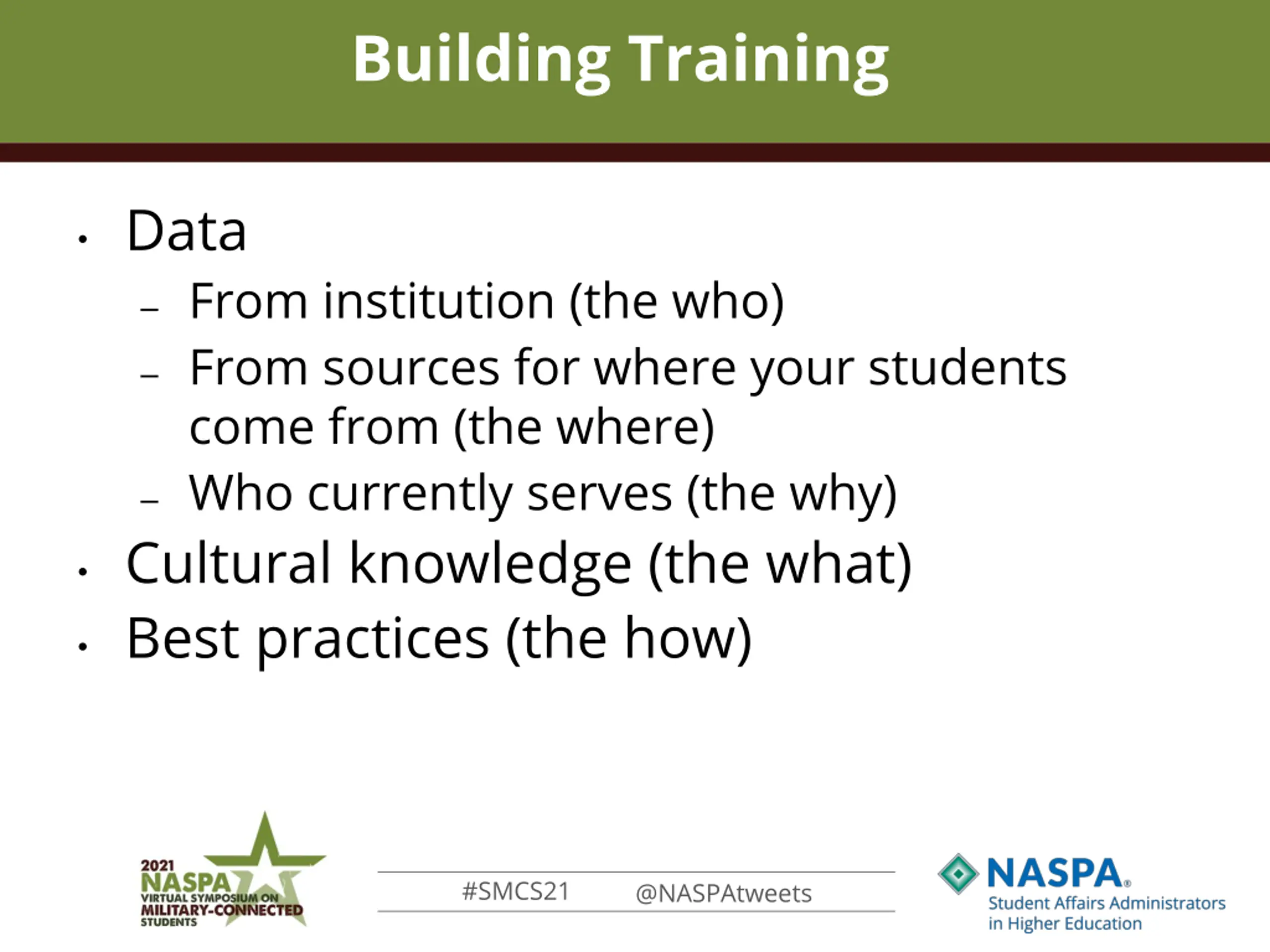 Building Training Data From institution (the who) From sources for where your students come from (the where) Who currently serves (the why) Cultural knowledge (the what) Best practices (the how) #SMCS21 @NASPAtweets
