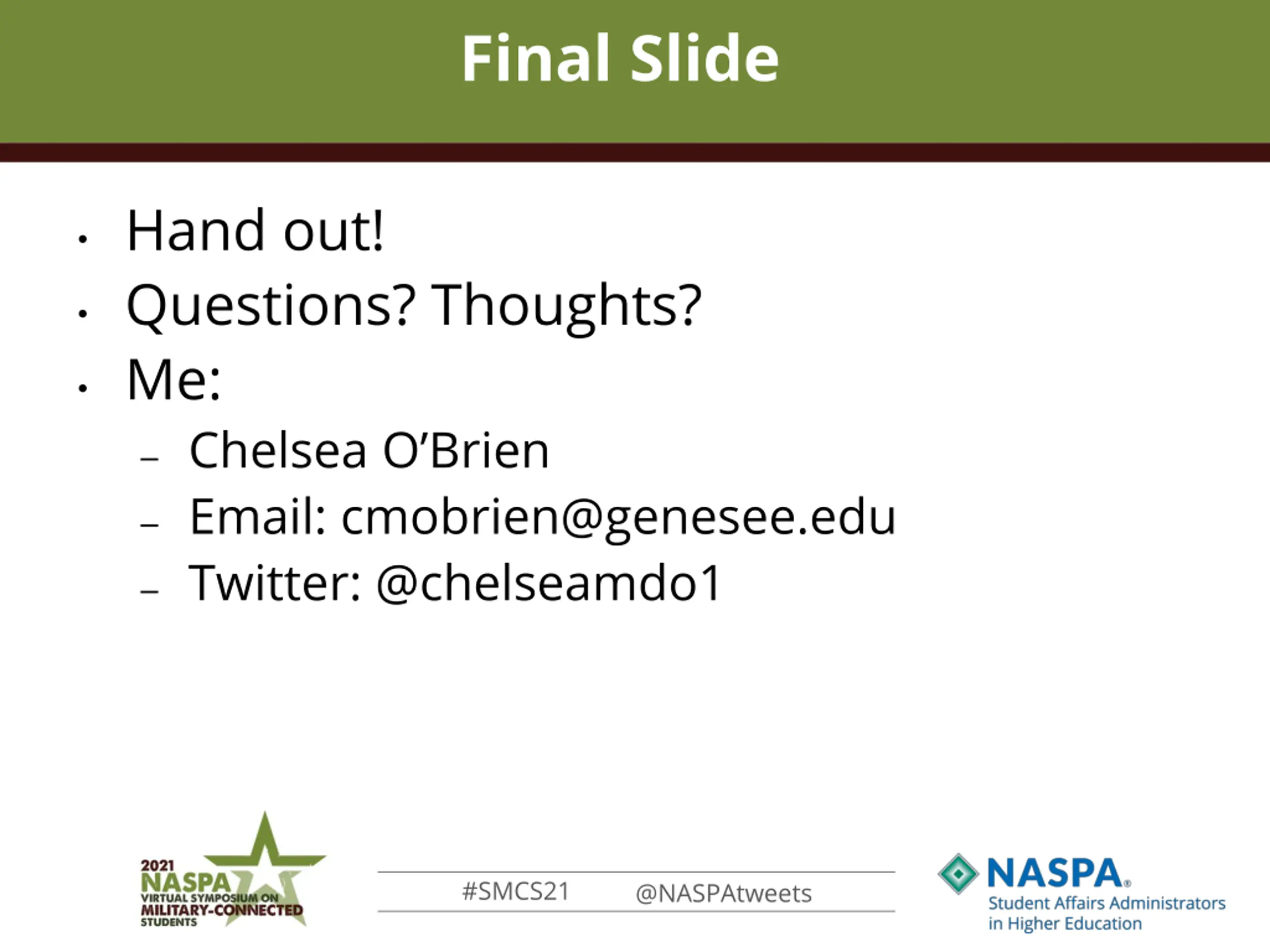 Final Slide Hand out! Questions? Thoughts? Me: Chelsea O Brien Email: cmobrien@genesee.edu Twitter: @chelseamdo1 #SMCS21 @NASPAtweets