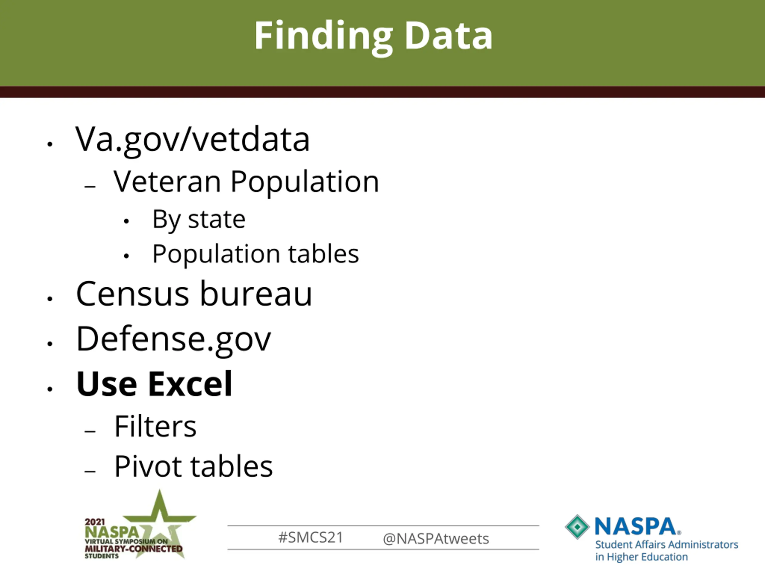 Finding Data Va.gov/vetdata Veteran Population By state Population tables Census bureau Defense.gov Use Excel Filters Pivot tables #SMCS21 @NASPAtweets