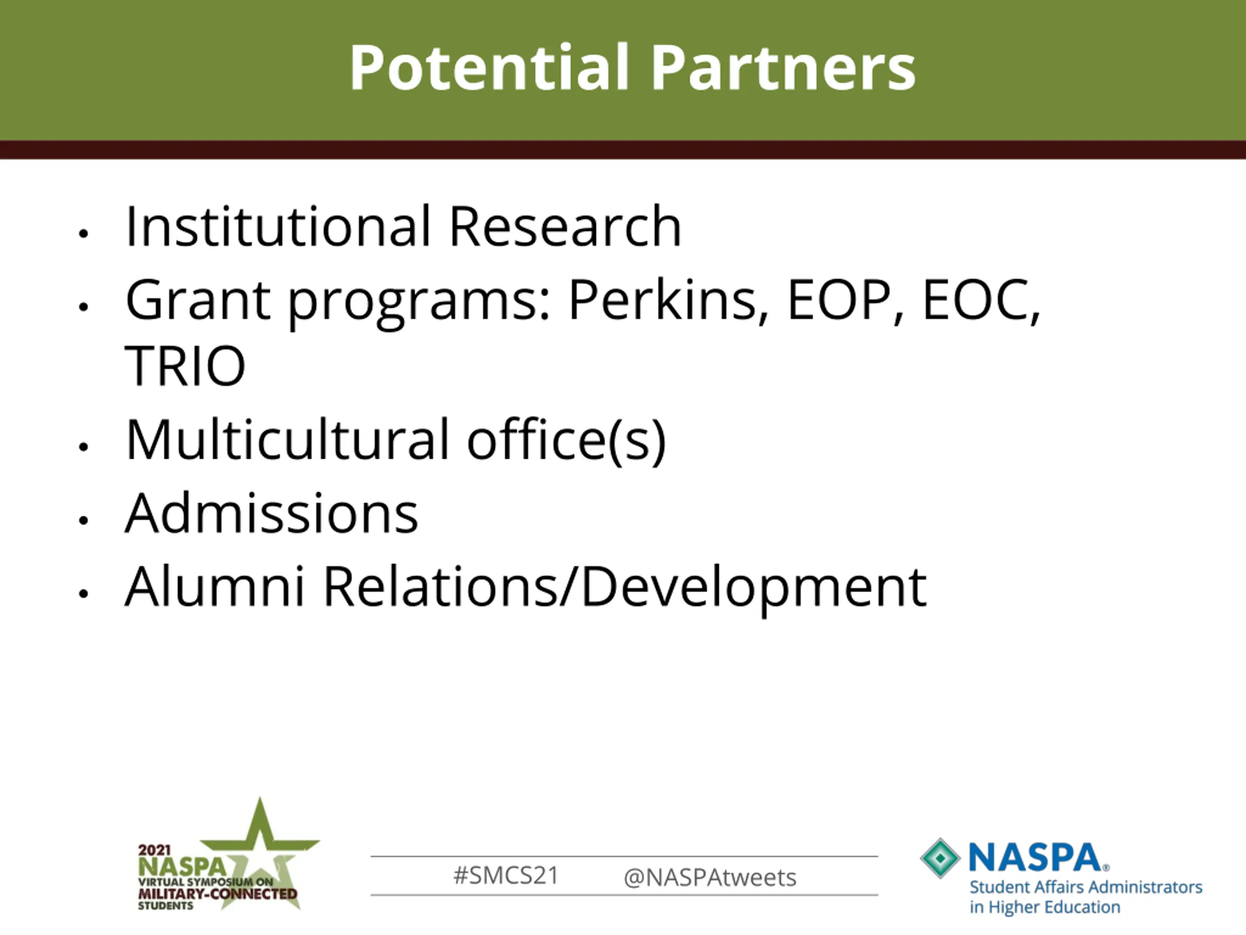 Potential Partners Institutional Research Grant programs: Perkins, EOP, EOC, TRIO Multicultural office(s) Admissions Alumni Relations/Development #SMCS21 @NASPAtweets
