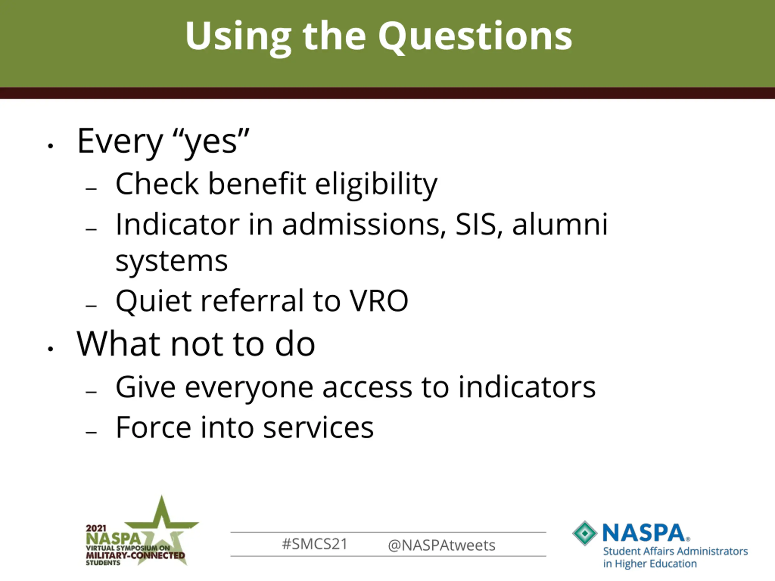 Using the Questions Every yes Check benefit eligibility Indicator in admissions, SIS, alumni systems Quiet referral to VRO What not to do Give everyone access to indicators Force into services #SMCS21 @NASPAtweets