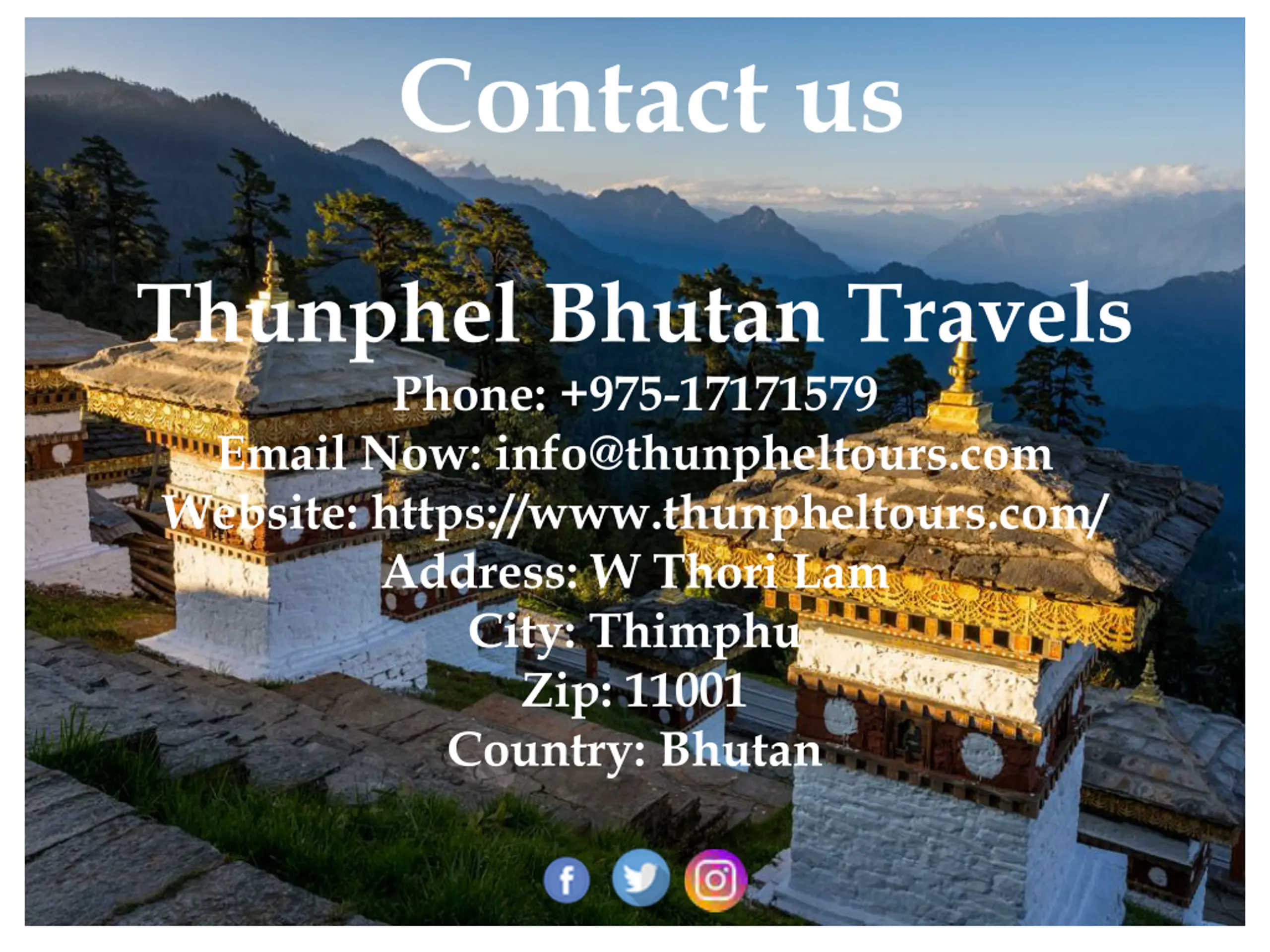Contact us Thunphel Bhutan Travels Phone: +975-17171579 Email Now: info@thunpheltours.com Website: https://www.thunpheltours.com/ Address: W Thori Lam City: Thimphu Zip: 11001 Country: Bhutan C:\Users\User\Desktop\twitter.png C:\Users\User\Desktop\facebook.png C:\Users\User\Desktop\instagram.png