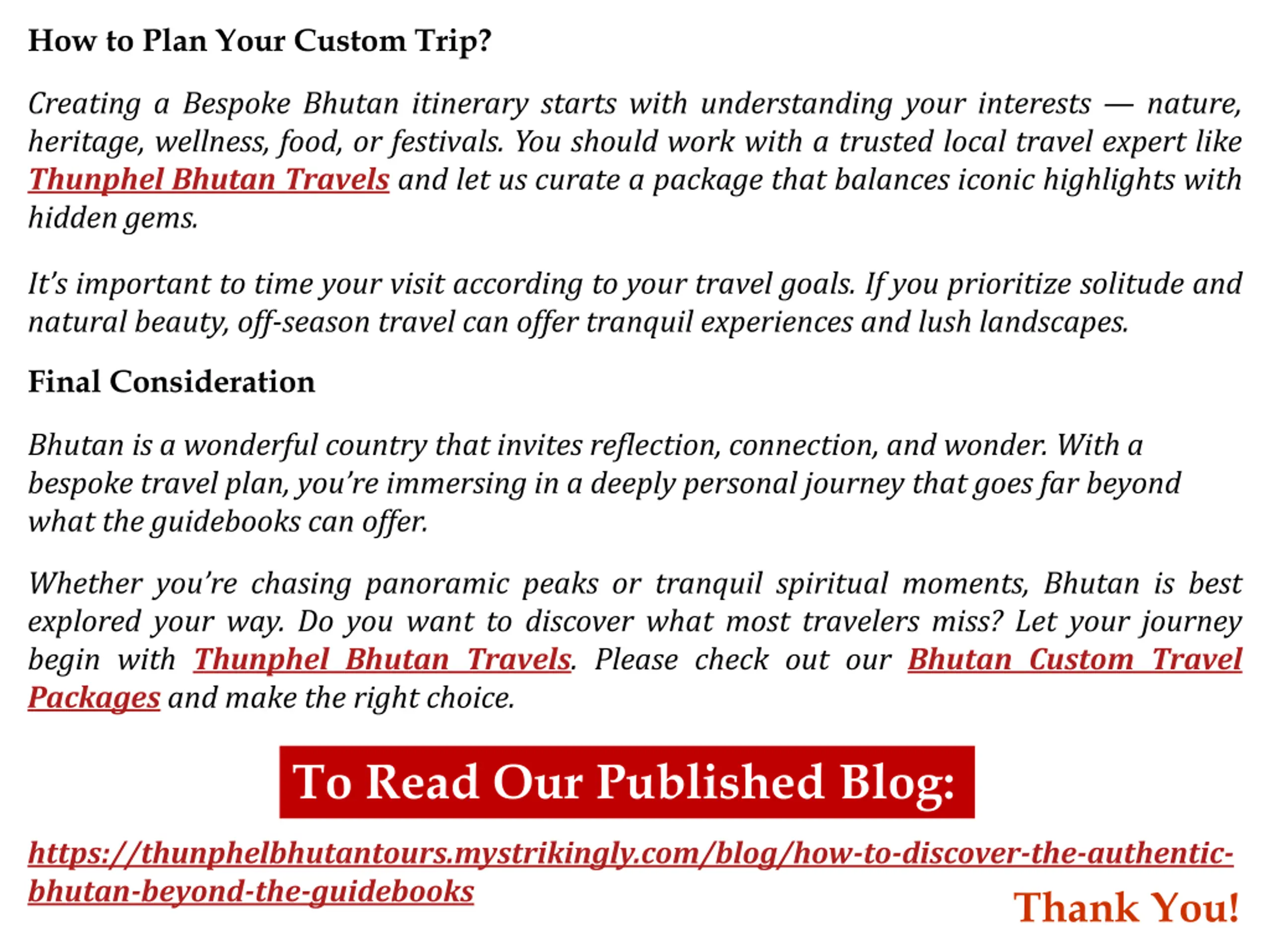 How to Plan Your Custom Trip? Creating a Bespoke Bhutan itinerary starts with understanding your interests nature, heritage, wellness, food, or festivals. You should work with a trusted local travel expert like Thunphel Bhutan Travels and let us curate a package that balances iconic highlights with hidden gems. It s important to time your visit according to your travel goals. If you prioritize solitude and natural beauty, off-season travel can offer tranquil experiences and lush landscapes. Final Consideration Bhutan is a wonderful country that invites reflection, connection, and wonder. With a bespoke travel plan, you re immersing in a deeply personal journey that goes far beyond what the guidebooks can offer. Whether you re chasing panoramic peaks or tranquil spiritual moments, Bhutan is best explored your way. Do you want to discover what most travelers miss? Let your journey begin with Thunphel Bhutan Travels. Please check out our Bhutan Custom Travel Packages and make the right choice. To Read Our Published Blog: https://thunphelbhutantours.mystrikingly.com/blog/how-to-discover-the-authentic- bhutan-beyond-the-guidebooks Thank You!