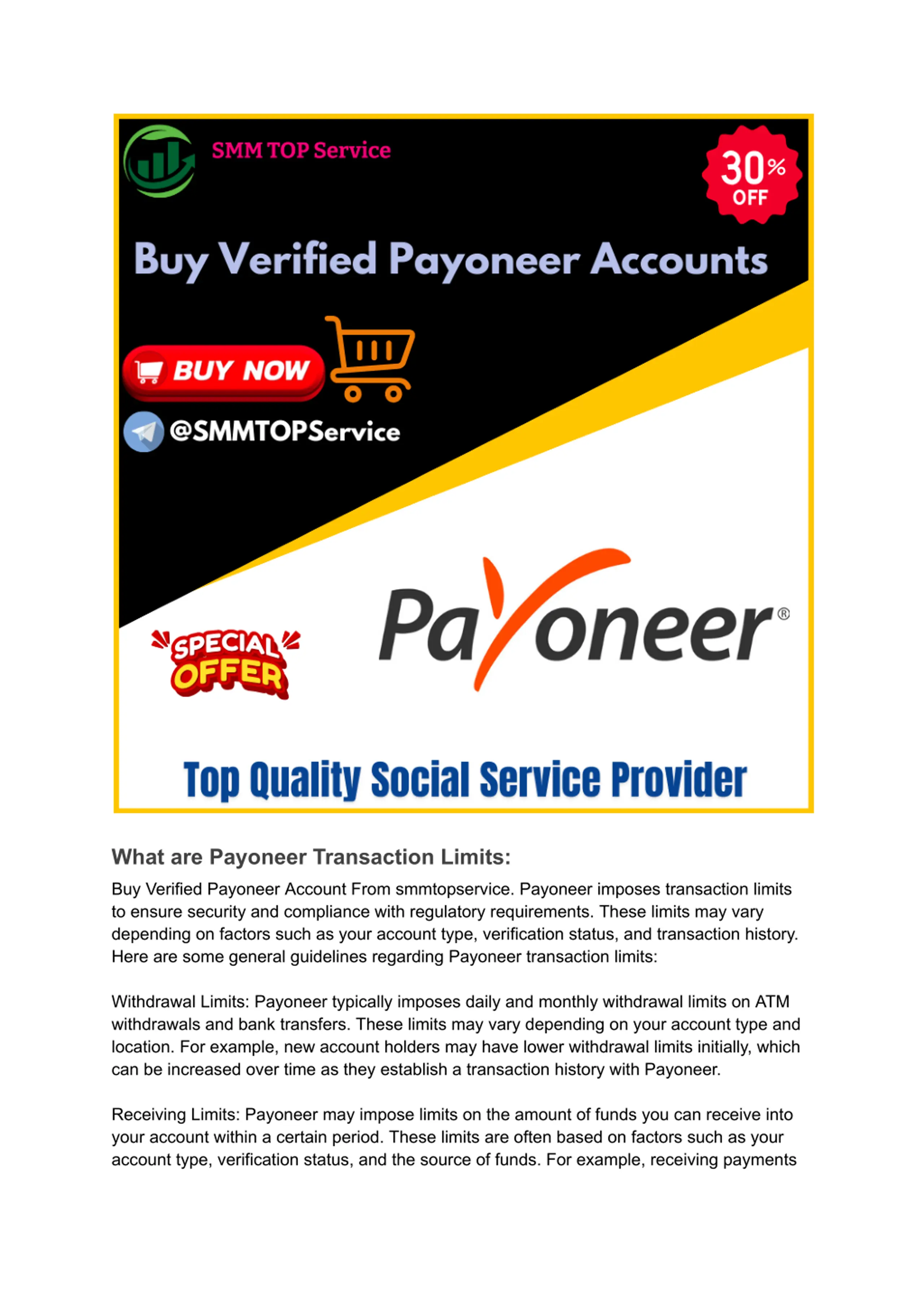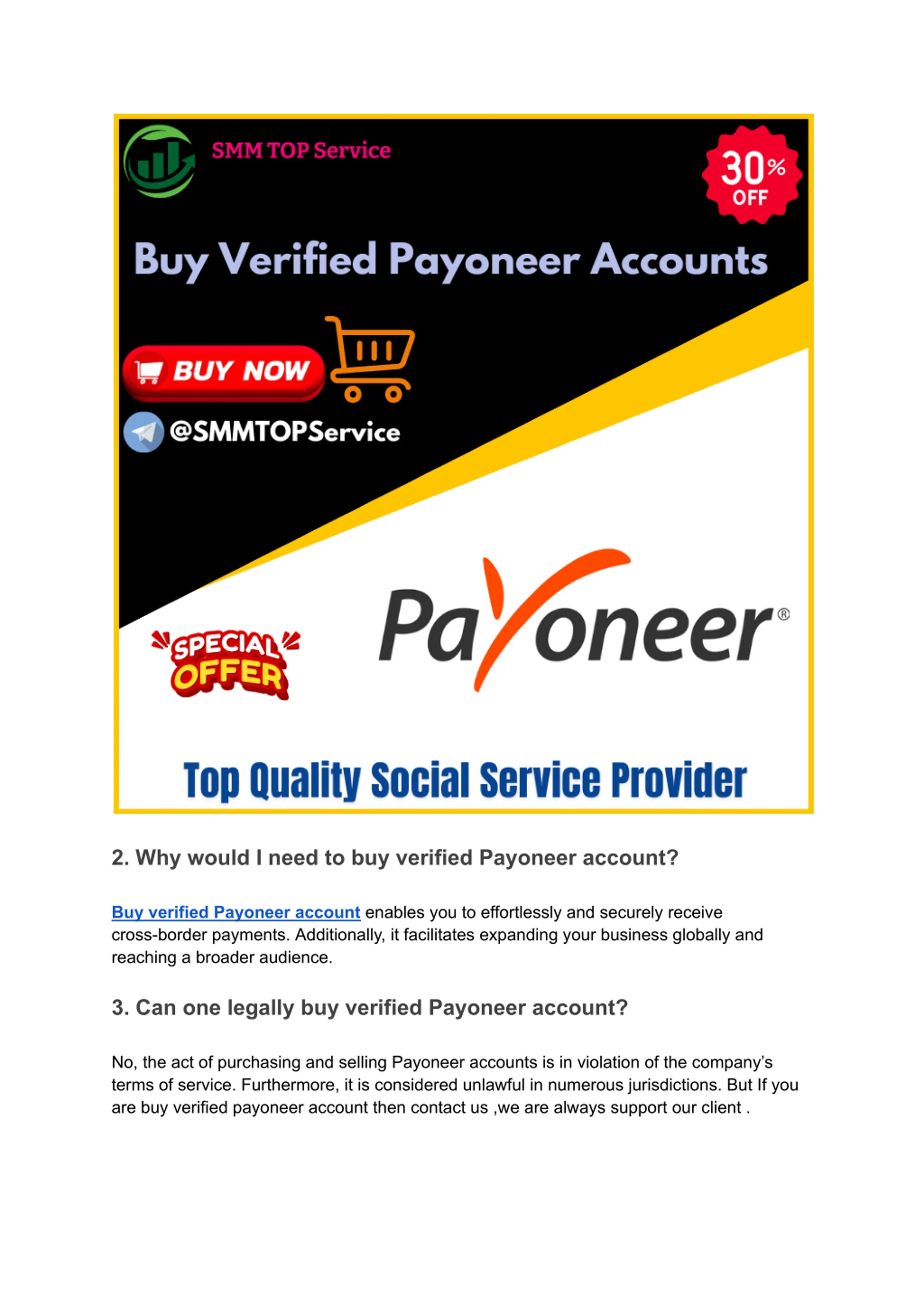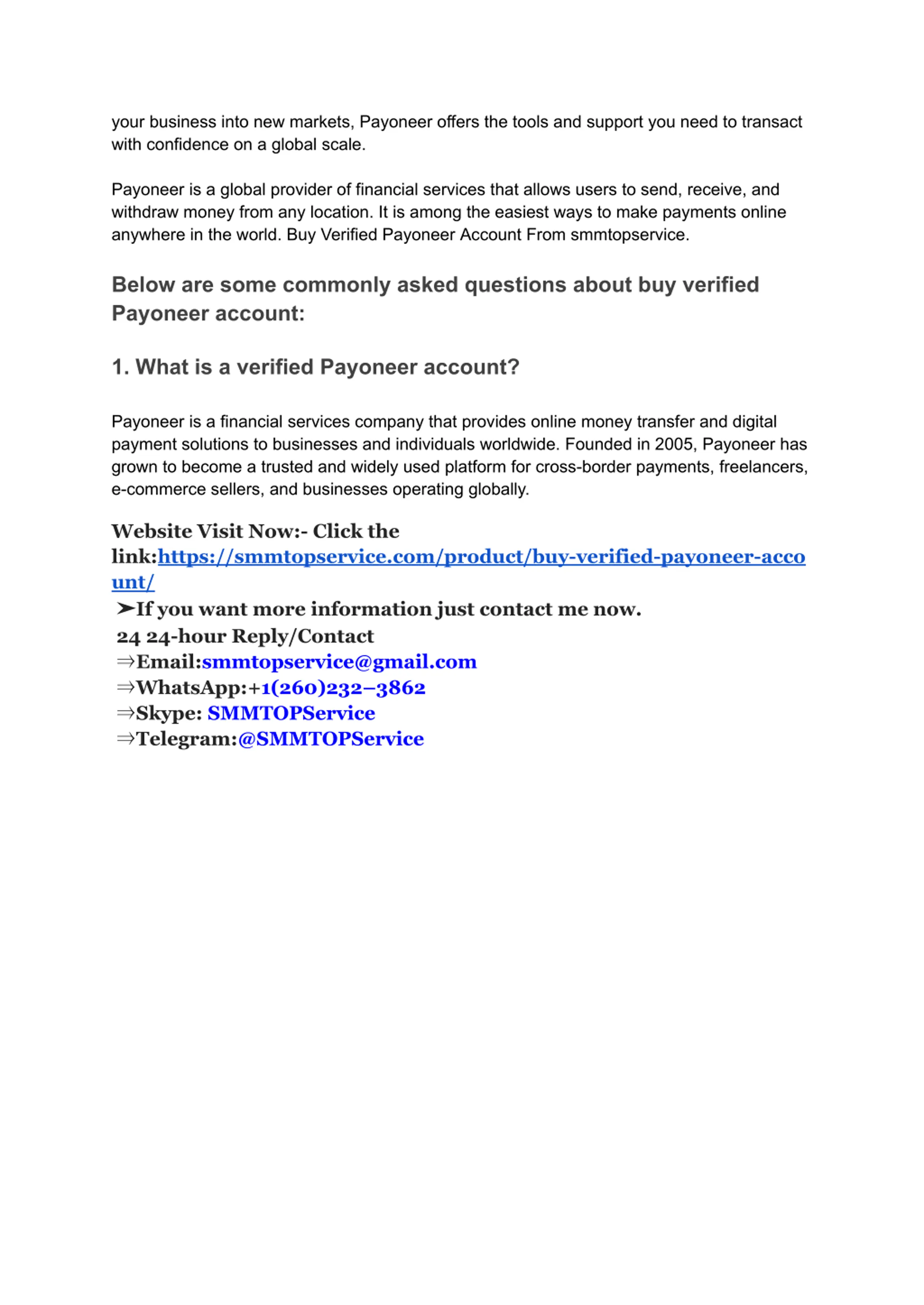 10. your business into new markets, Payoneer offers the tools and support you need to transact with confidence on a global scale. Payoneer is a global provider of financial services that allows users to send, receive, and withdraw money from any location. It is among the easiest ways to make payments online anywhere in the world. Buy Verified Payoneer Account From smmtopservice. Below are some commonly asked questions about buy verified Payoneer account: 1. What is a verified Payoneer account? Payoneer is a financial services company that provides online money transfer and digital payment solutions to businesses and individuals worldwide. Founded in 2005, Payoneer has grown to become a trusted and widely used platform for cross-border payments, freelancers, e-commerce sellers, and businesses operating globally. Website Visit Now:- Click the link:https://smmtopservice.com/product/buy-verified-payoneer-acco unt/ If you want more information just contact me now. 24 24-hour Reply/Contact Email:smmtopservice@gmail.com WhatsApp:+1(260)232 3862 Skype: SMMTOPService Telegram:@SMMTOPService