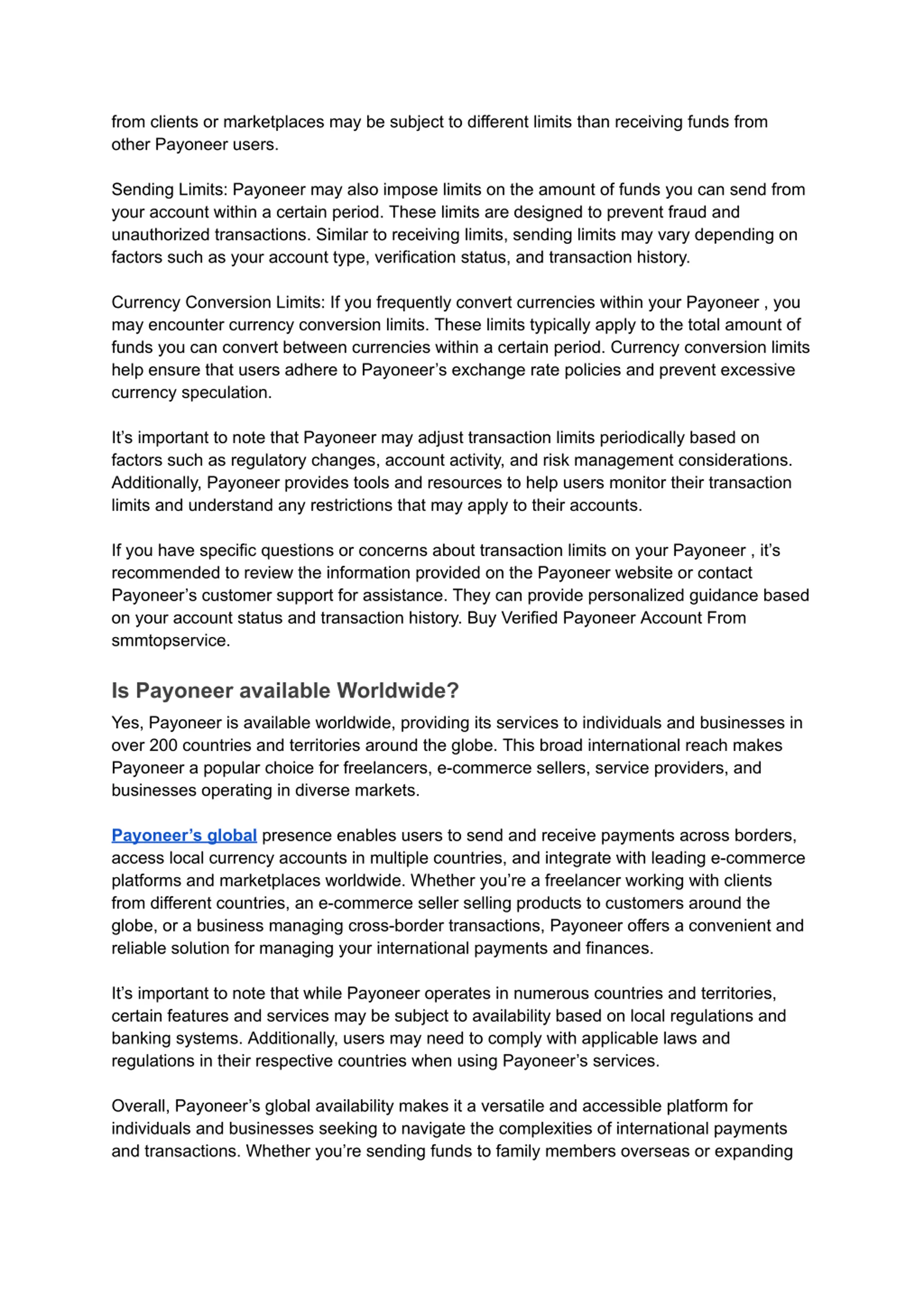 9. from clients or marketplaces may be subject to different limits than receiving funds from other Payoneer users. Sending Limits: Payoneer may also impose limits on the amount of funds you can send from your account within a certain period. These limits are designed to prevent fraud and unauthorized transactions. Similar to receiving limits, sending limits may vary depending on factors such as your account type, verification status, and transaction history. Currency Conversion Limits: If you frequently convert currencies within your Payoneer , you may encounter currency conversion limits. These limits typically apply to the total amount of funds you can convert between currencies within a certain period. Currency conversion limits help ensure that users adhere to Payoneer s exchange rate policies and prevent excessive currency speculation. It s important to note that Payoneer may adjust transaction limits periodically based on factors such as regulatory changes, account activity, and risk management considerations. Additionally, Payoneer provides tools and resources to help users monitor their transaction limits and understand any restrictions that may apply to their accounts. If you have specific questions or concerns about transaction limits on your Payoneer , it s recommended to review the information provided on the Payoneer website or contact Payoneer s customer support for assistance. They can provide personalized guidance based on your account status and transaction history. Buy Verified Payoneer Account From smmtopservice. Is Payoneer available Worldwide? Yes, Payoneer is available worldwide, providing its services to individuals and businesses in over 200 countries and territories around the globe. This broad international reach makes Payoneer a popular choice for freelancers, e-commerce sellers, service providers, and businesses operating in diverse markets. Payoneer s global presence enables users to send and receive payments across borders, access local currency accounts in multiple countries, and integrate with leading e-commerce platforms and marketplaces worldwide. Whether you re a freelancer working with clients from different countries, an e-commerce seller selling products to customers around the globe, or a business managing cross-border transactions, Payoneer offers a convenient and reliable solution for managing your international payments and finances. It s important to note that while Payoneer operates in numerous countries and territories, certain features and services may be subject to availability based on local regulations and banking systems. Additionally, users may need to comply with applicable laws and regulations in their respective countries when using Payoneer s services. Overall, Payoneer s global availability makes it a versatile and accessible platform for individuals and businesses seeking to navigate the complexities of international payments and transactions. Whether you re sending funds to family members overseas or expanding