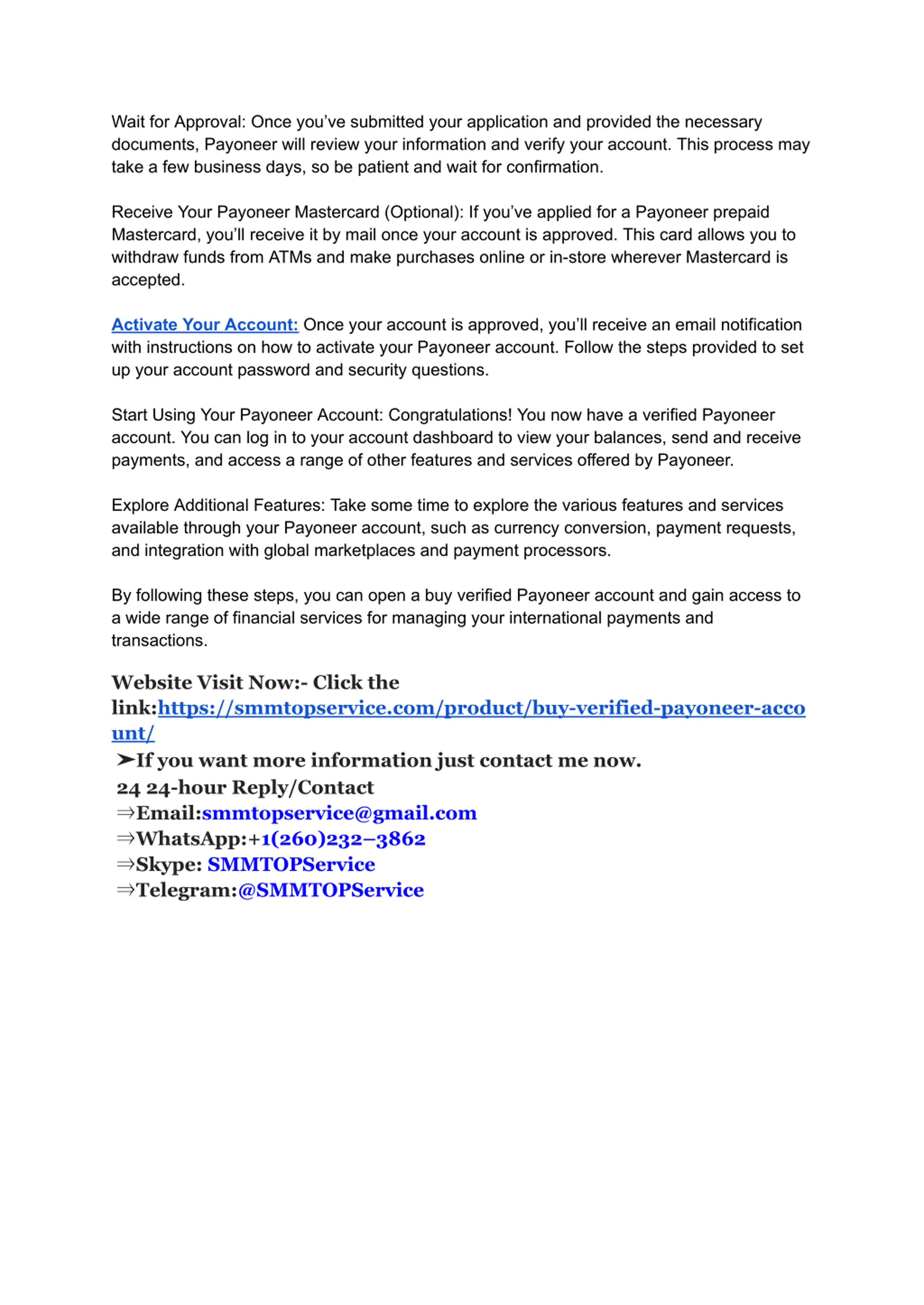 7. Wait for Approval: Once youve submitted your application and provided the necessary documents, Payoneer will review your information and verify your account. This process may take a few business days, so be patient and wait for confirmation. Receive Your Payoneer Mastercard (Optional): If you ve applied for a Payoneer prepaid Mastercard, you ll receive it by mail once your account is approved. This card allows you to withdraw funds from ATMs and make purchases online or in-store wherever Mastercard is accepted. Activate Your Account: Once your account is approved, you ll receive an email notification with instructions on how to activate your Payoneer account. Follow the steps provided to set up your account password and security questions. Start Using Your Payoneer Account: Congratulations! You now have a verified Payoneer account. You can log in to your account dashboard to view your balances, send and receive payments, and access a range of other features and services offered by Payoneer. Explore Additional Features: Take some time to explore the various features and services available through your Payoneer account, such as currency conversion, payment requests, and integration with global marketplaces and payment processors. By following these steps, you can open a buy verified Payoneer account and gain access to a wide range of financial services for managing your international payments and transactions. Website Visit Now:- Click the link:https://smmtopservice.com/product/buy-verified-payoneer-acco unt/ If you want more information just contact me now. 24 24-hour Reply/Contact Email:smmtopservice@gmail.com WhatsApp:+1(260)232 3862 Skype: SMMTOPService Telegram:@SMMTOPService
