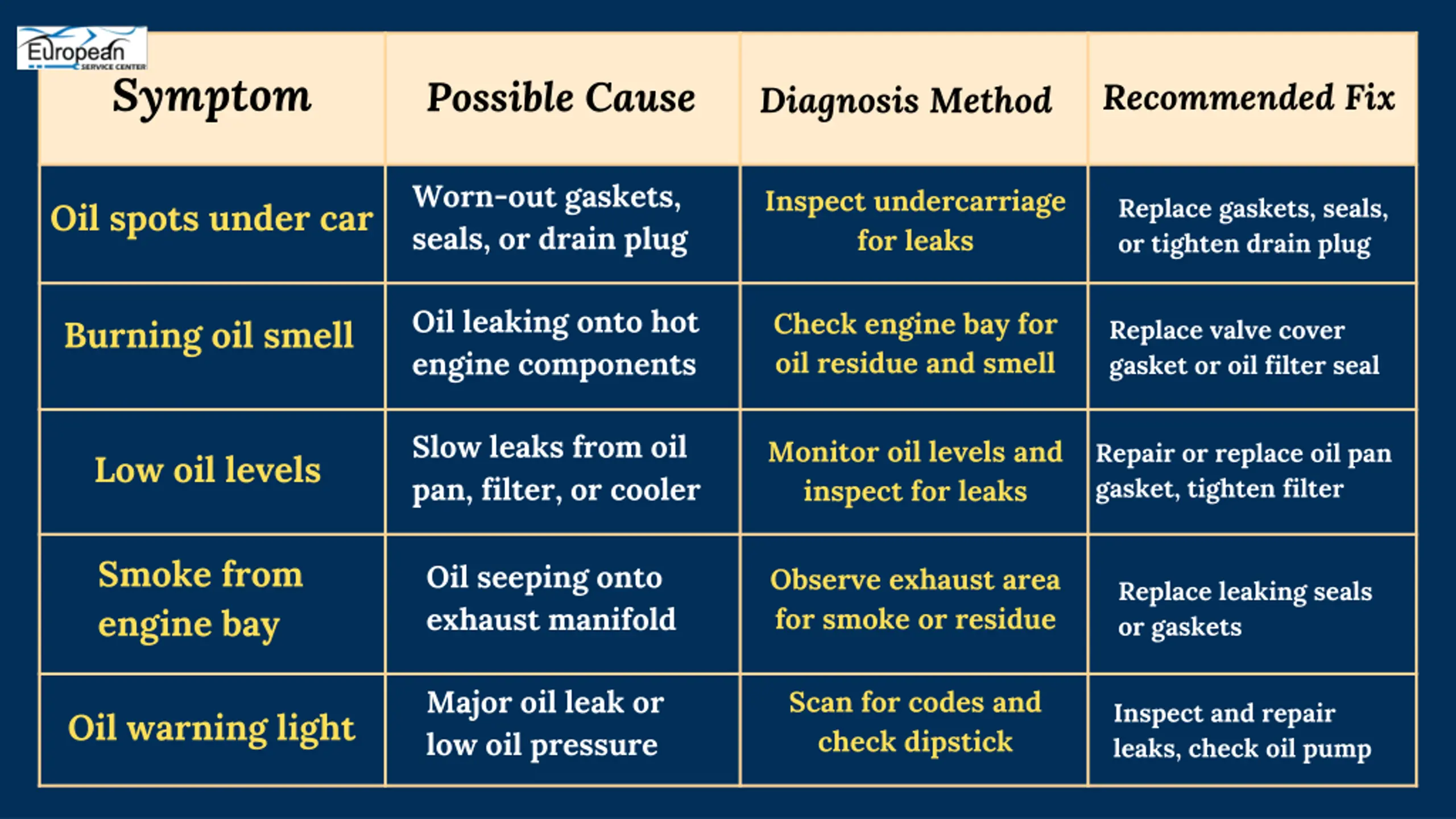 Symptom Possible Cause Recommended Fix Diagnosis Method Worn-out gaskets, seals, or drain plug Inspect undercarriage for leaks Replace gaskets, seals, or tighten drain plug Oil spots under car Oil leaking onto hot engine components Check engine bay for oil residue and smell Burning oil smell Replace valve cover gasket or oil filter seal Slow leaks from oil pan, filter, or cooler Monitor oil levels and inspect for leaks Repair or replace oil pan gasket, tighten filter Low oil levels Smoke from engine bay Oil seeping onto exhaust manifold Observe exhaust area for smoke or residue Replace leaking seals or gaskets Major oil leak or low oil pressure Scan for codes and check dipstick Inspect and repair leaks, check oil pump Oil warning light