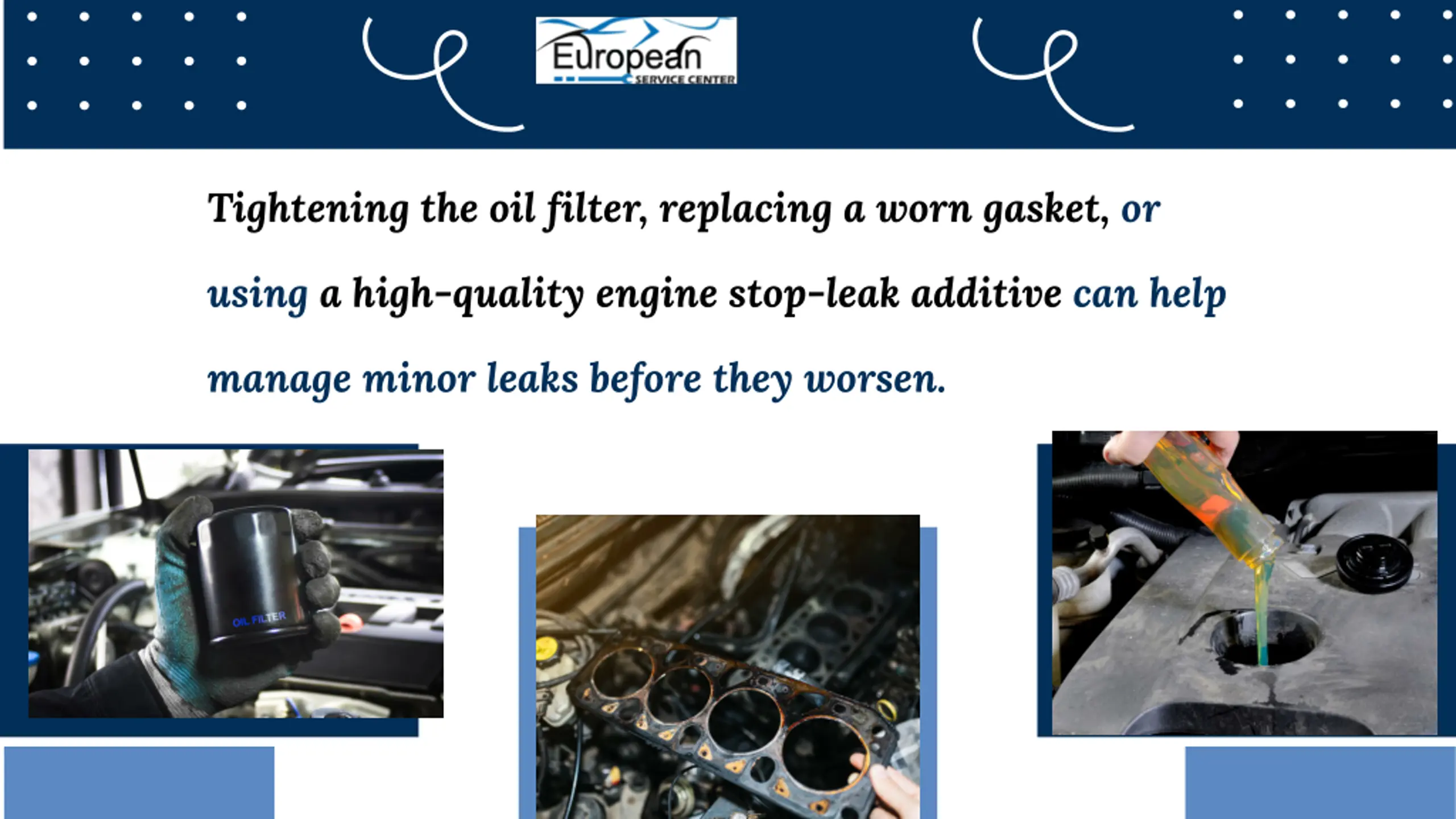 Tightening the oil filter, replacing a worn gasket, or using a high-quality engine stop-leak additive can help manage minor leaks before they worsen.