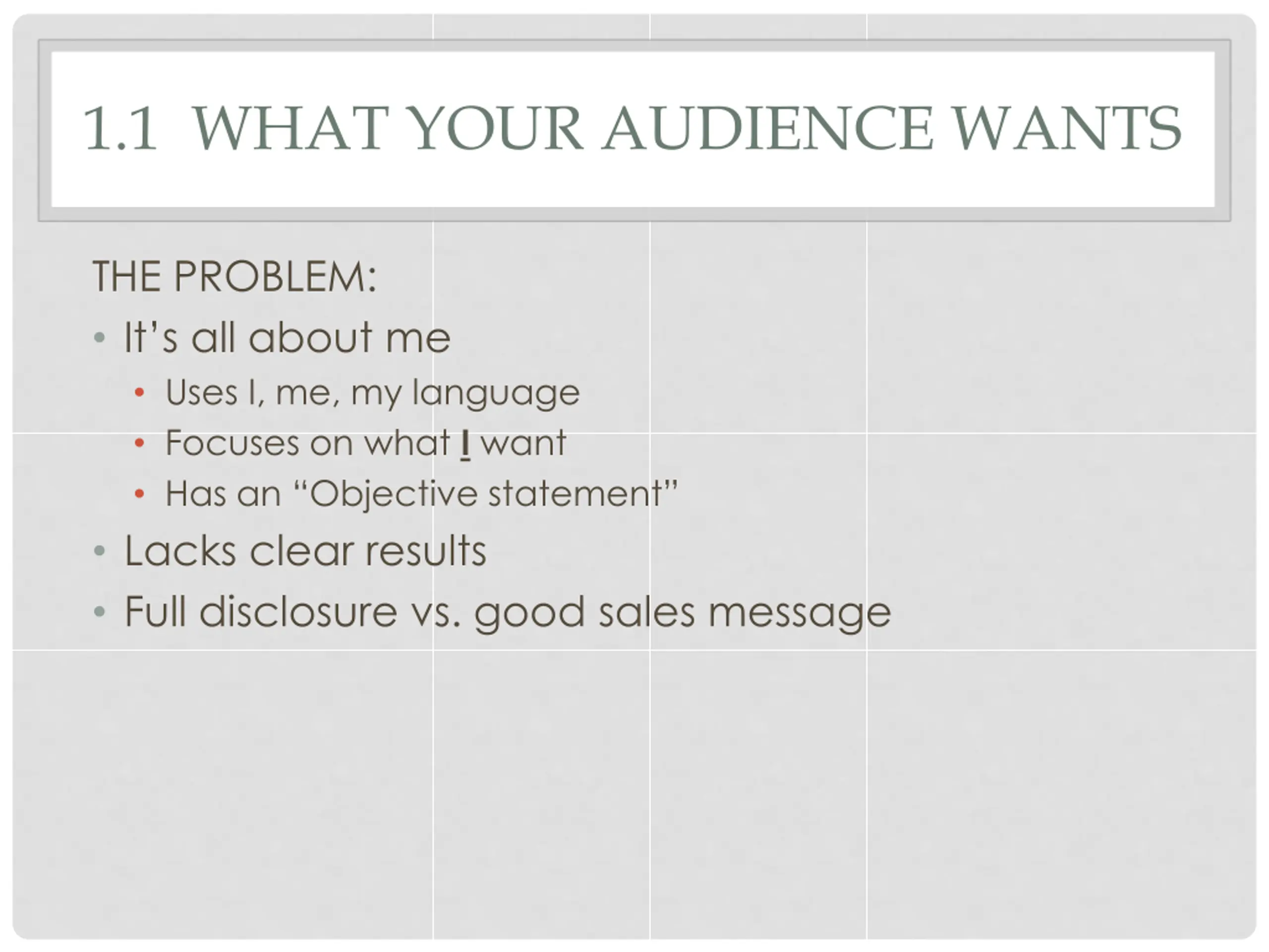 1.1 WHAT YOUR AUDIENCE WANTS THE PROBLEM: It s all about me Uses I, me, my language Focuses on what I want Has an Objective statement Lacks clear results Full disclosure vs. good sales message