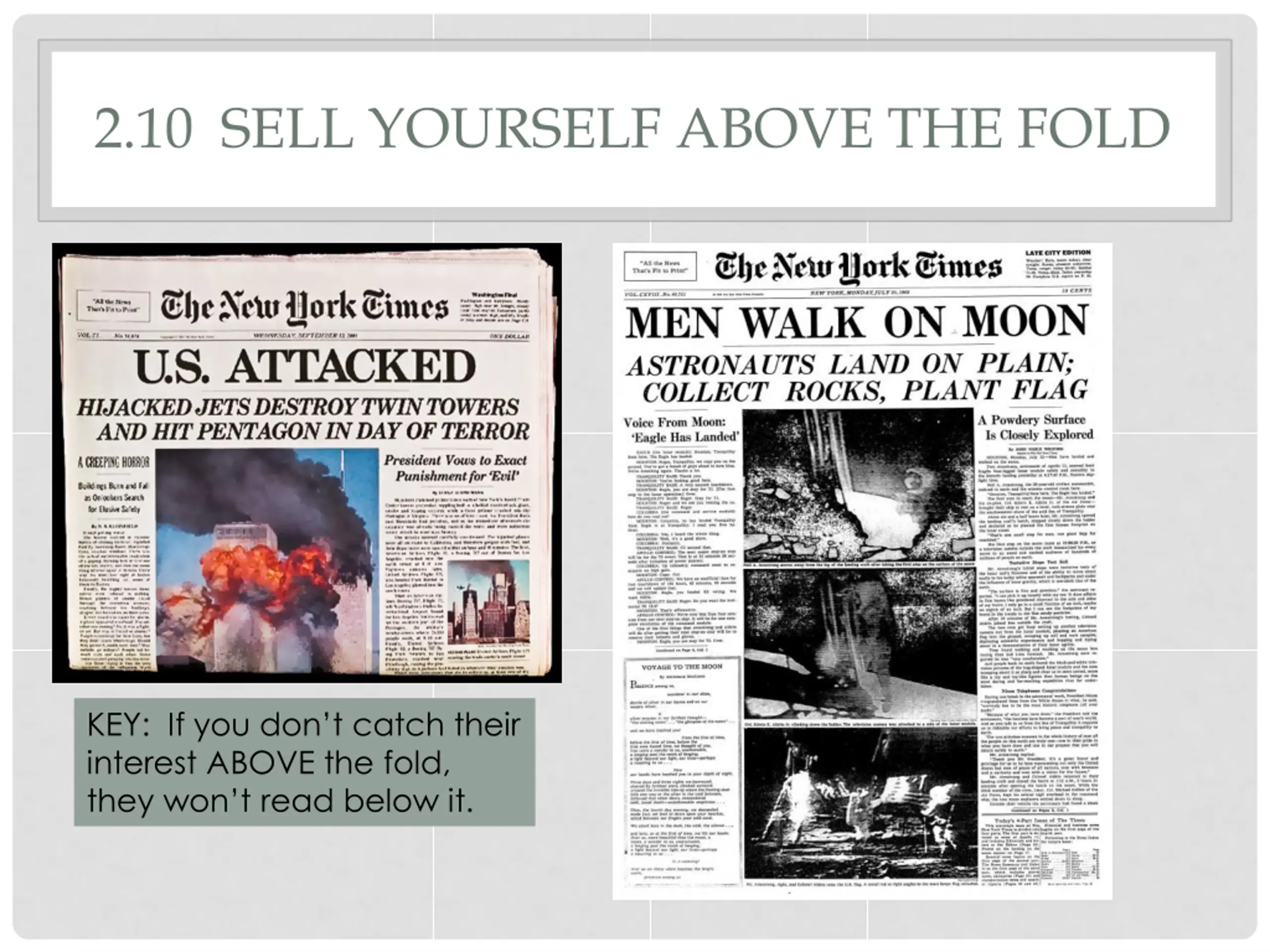2.10 SELL YOURSELF ABOVE THE FOLD KEY: If you don t catch their interest ABOVE the fold, they won t read below it.