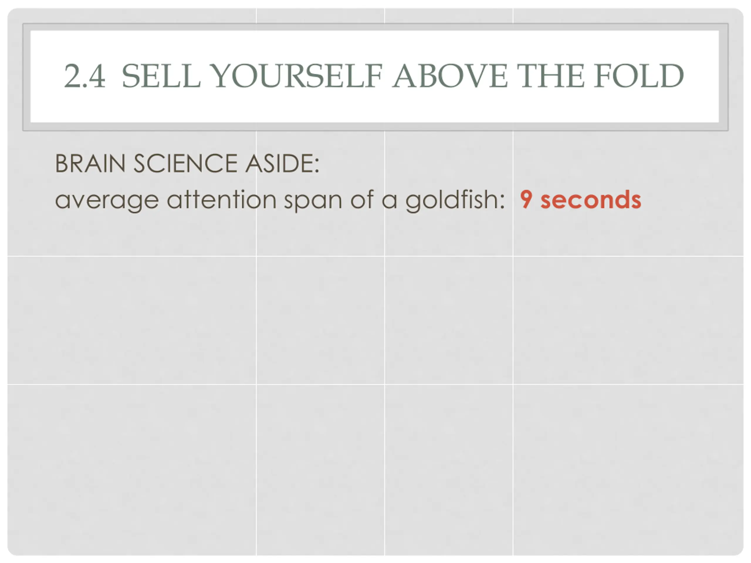 2.4 SELL YOURSELF ABOVE THE FOLD BRAIN SCIENCE ASIDE: average attention span of a goldfish: 9 seconds