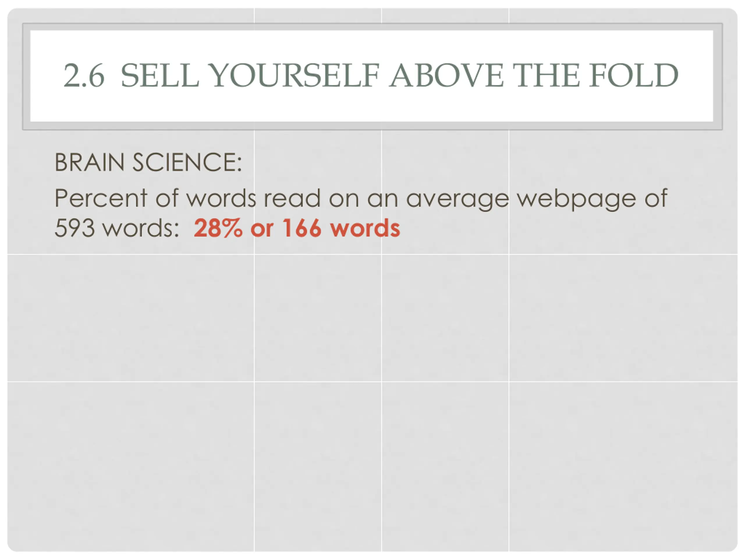 2.6 SELL YOURSELF ABOVE THE FOLD BRAIN SCIENCE: Percent of words read on an average webpage of 593 words: 28% or 166 words