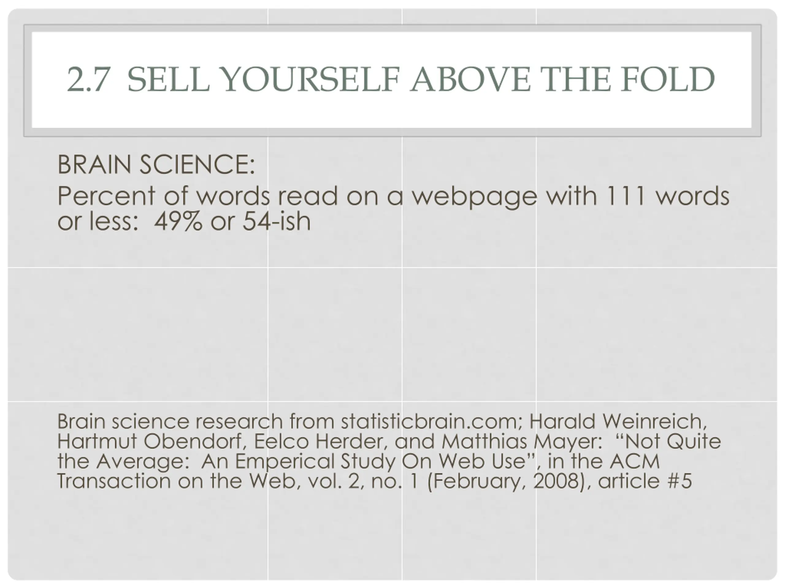 2.7 SELL YOURSELF ABOVE THE FOLD BRAIN SCIENCE: Percent of words read on a webpage with 111 words or less: 49% or 54-ish Brain science research from statisticbrain.com; Harald Weinreich, Hartmut Obendorf, Eelco Herder, and Matthias Mayer: Not Quite the Average: An Emperical Study On Web Use , in the ACM Transaction on the Web, vol. 2, no. 1 (February, 2008), article #5