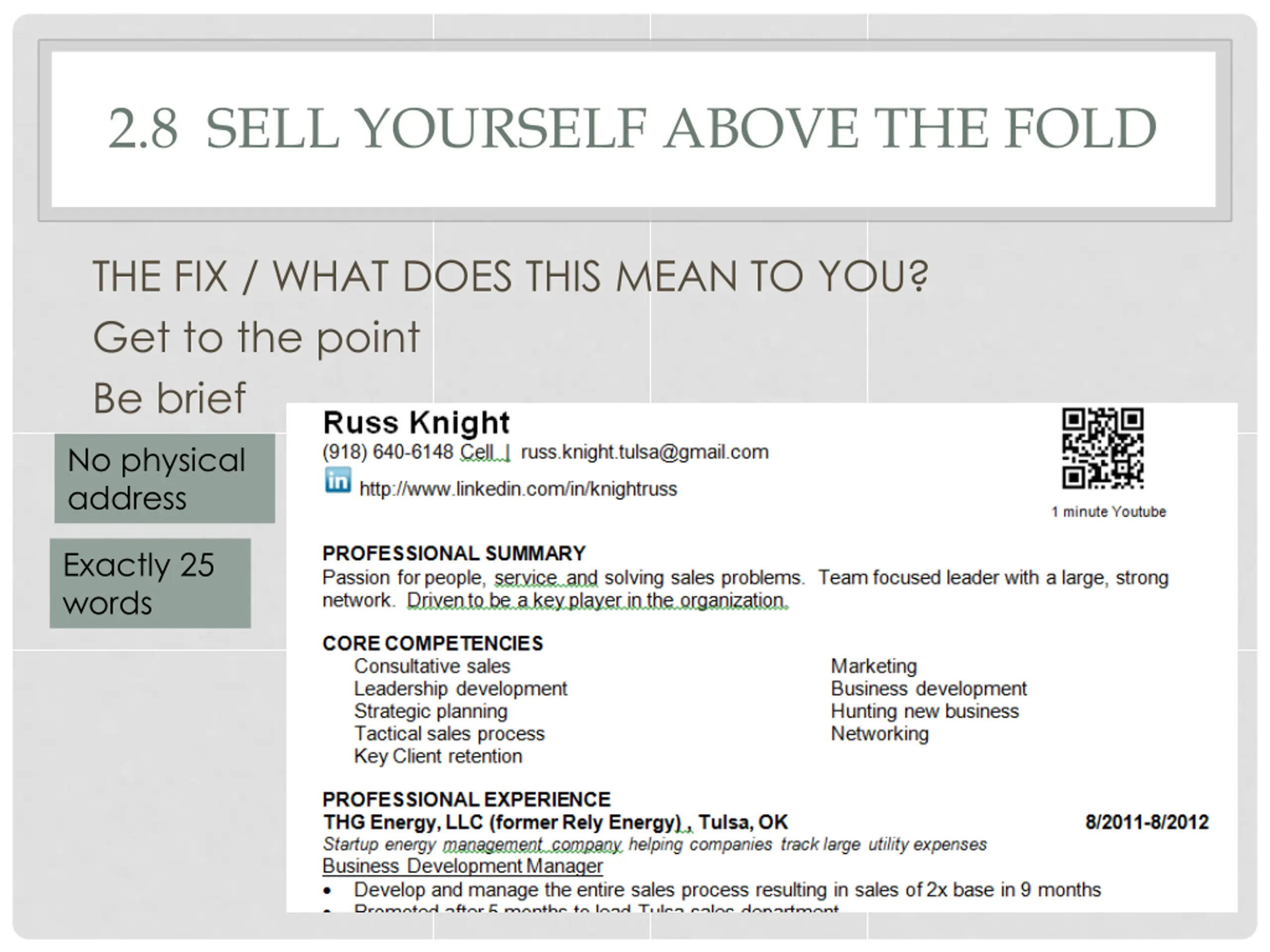 2.8 SELL YOURSELF ABOVE THE FOLD THE FIX / WHAT DOES THIS MEAN TO YOU? Get to the point Be brief No physical address Exactly 25 words