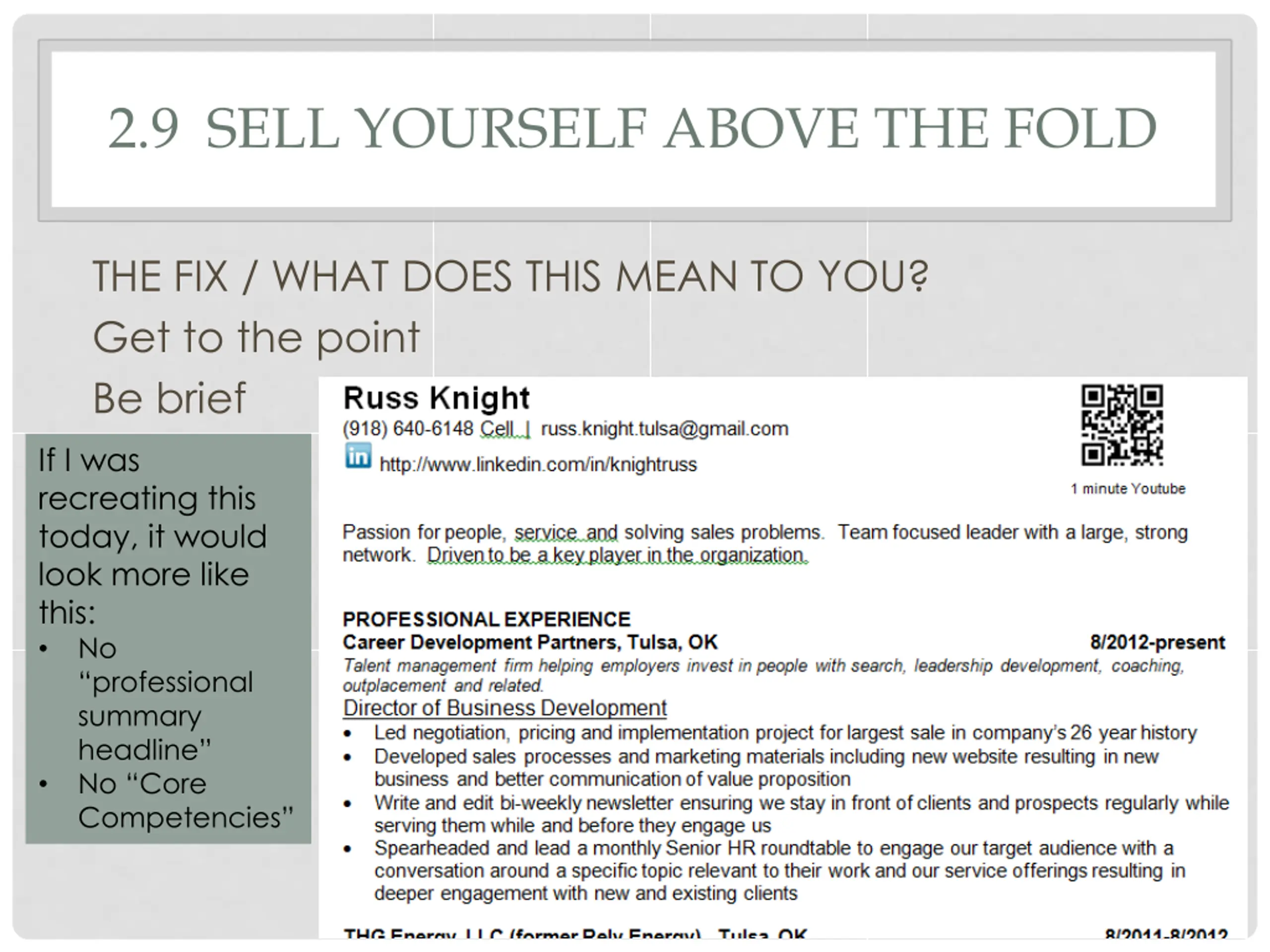 2.9 SELL YOURSELF ABOVE THE FOLD THE FIX / WHAT DOES THIS MEAN TO YOU? Get to the point Be brief If I was recreating this today, it would look more like this: No professional summary headline No Core Competencies