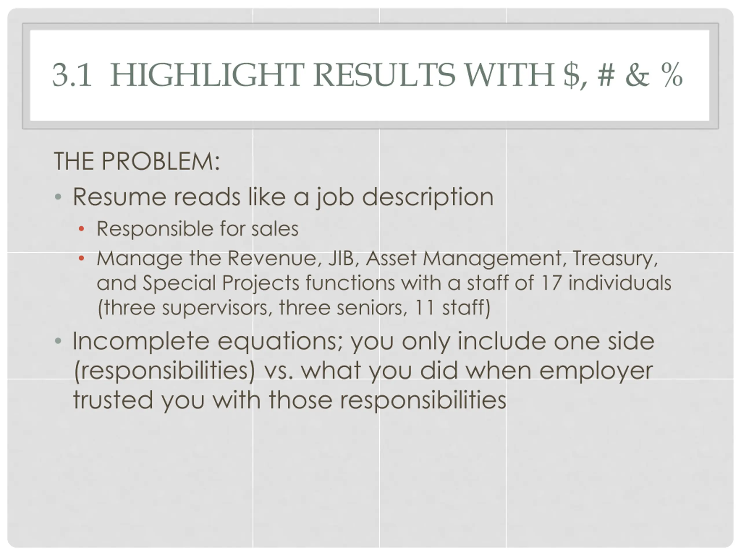 3.1 HIGHLIGHT RESULTS WITH $, # & % THE PROBLEM: Resume reads like a job description Responsible for sales Manage the Revenue, JIB, Asset Management, Treasury, and Special Projects functions with a staff of 17 individuals (three supervisors, three seniors, 11 staff) Incomplete equations; you only include one side (responsibilities) vs. what you did when employer trusted you with those responsibilities