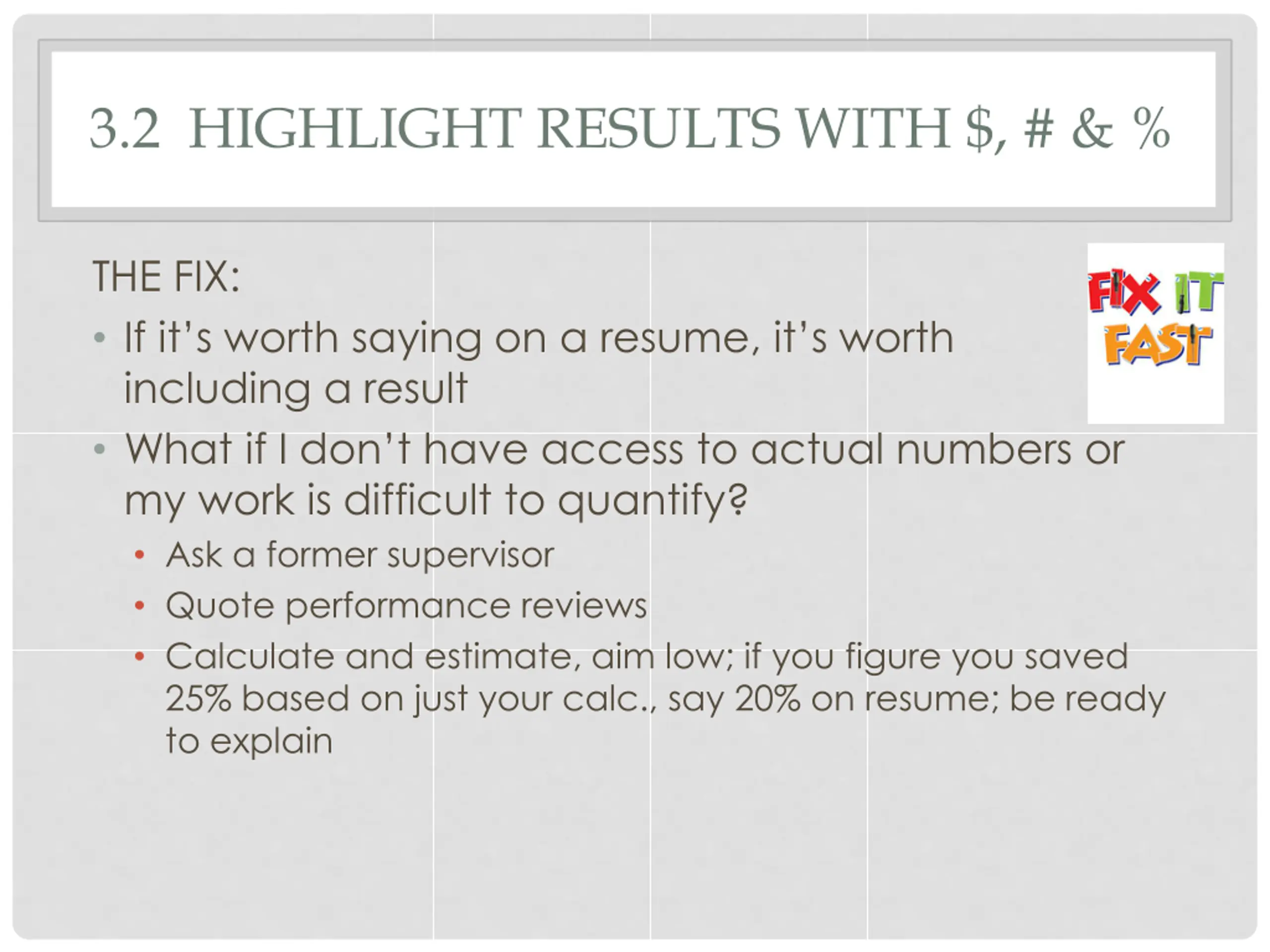 3.2 HIGHLIGHT RESULTS WITH $, # & % THE FIX: If it s worth saying on a resume, it s worth including a result What if I don t have access to actual numbers or my work is difficult to quantify? Ask a former supervisor Quote performance reviews Calculate and estimate, aim low; if you figure you saved 25% based on just your calc., say 20% on resume; be ready to explain