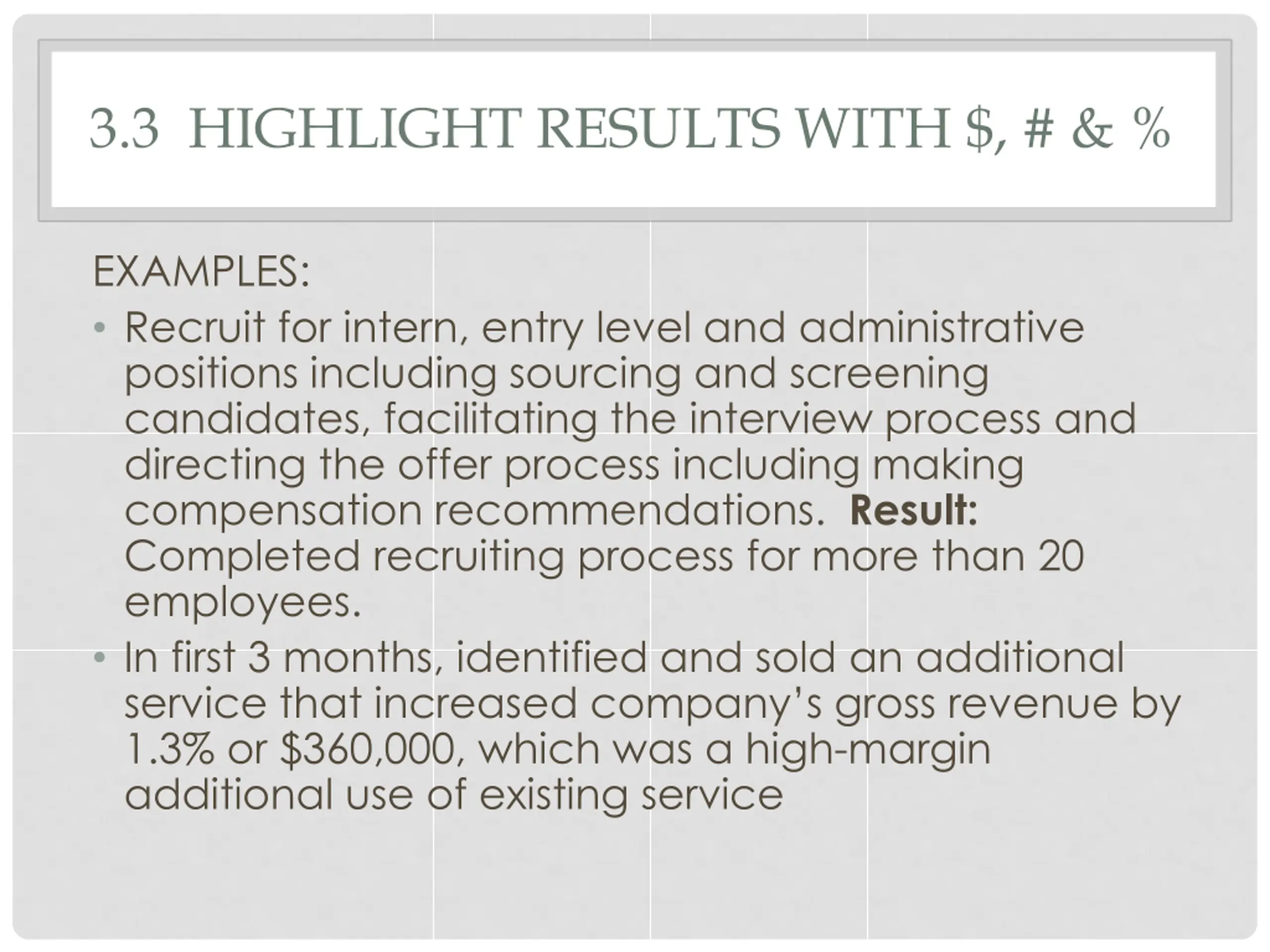 3.3 HIGHLIGHT RESULTS WITH $, # & % EXAMPLES: Recruit for intern, entry level and administrative positions including sourcing and screening candidates, facilitating the interview process and directing the offer process including making compensation recommendations. Result: Completed recruiting process for more than 20 employees. In first 3 months, identified and sold an additional service that increased company s gross revenue by 1.3% or $360,000, which was a high-margin additional use of existing service