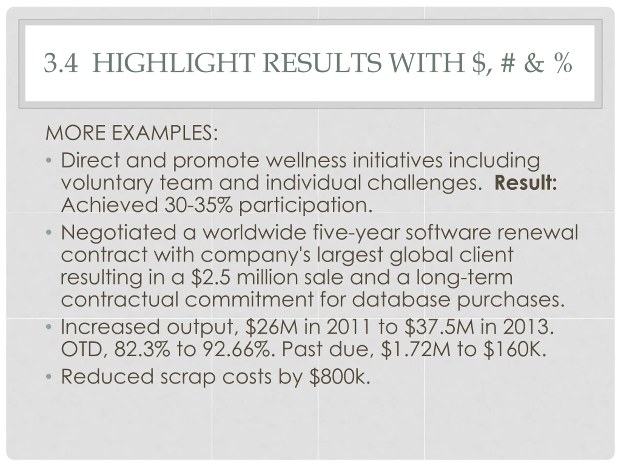 3.4 HIGHLIGHT RESULTS WITH $, # & % MORE EXAMPLES: Direct and promote wellness initiatives including voluntary team and individual challenges. Result: Achieved 30-35% participation. Negotiated a worldwide five-year software renewal contract with company's largest global client resulting in a $2.5 million sale and a long-term contractual commitment for database purchases. Increased output, $26M in 2011 to $37.5M in 2013. OTD, 82.3% to 92.66%. Past due, $1.72M to $160K. Reduced scrap costs by $800k.