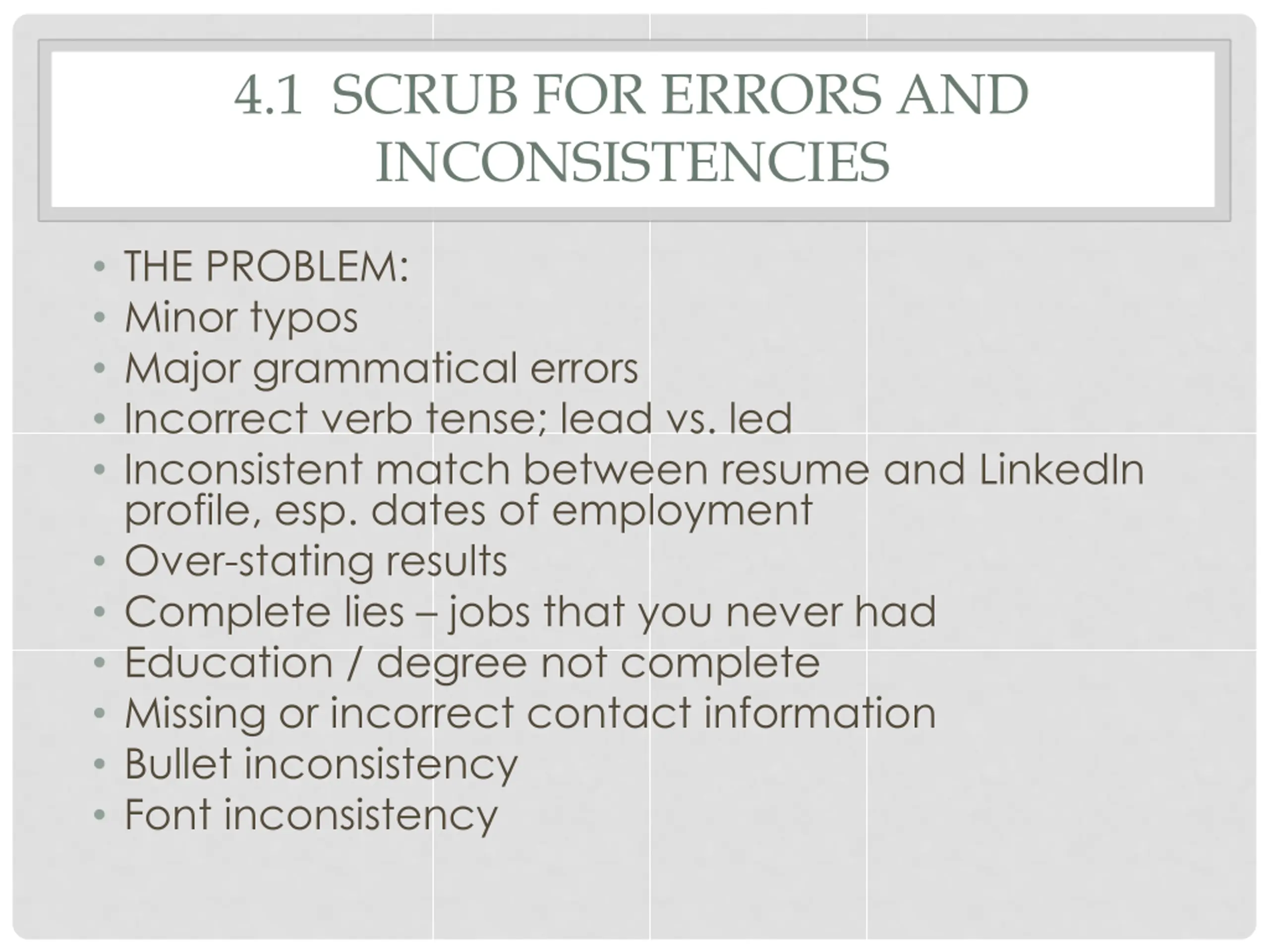 4.1 SCRUB FOR ERRORS AND INCONSISTENCIES THE PROBLEM: Minor typos Major grammatical errors Incorrect verb tense; lead vs. led Inconsistent match between resume and LinkedIn profile, esp. dates of employment Over-stating results Complete lies jobs that you never had Education / degree not complete Missing or incorrect contact information Bullet inconsistency Font inconsistency