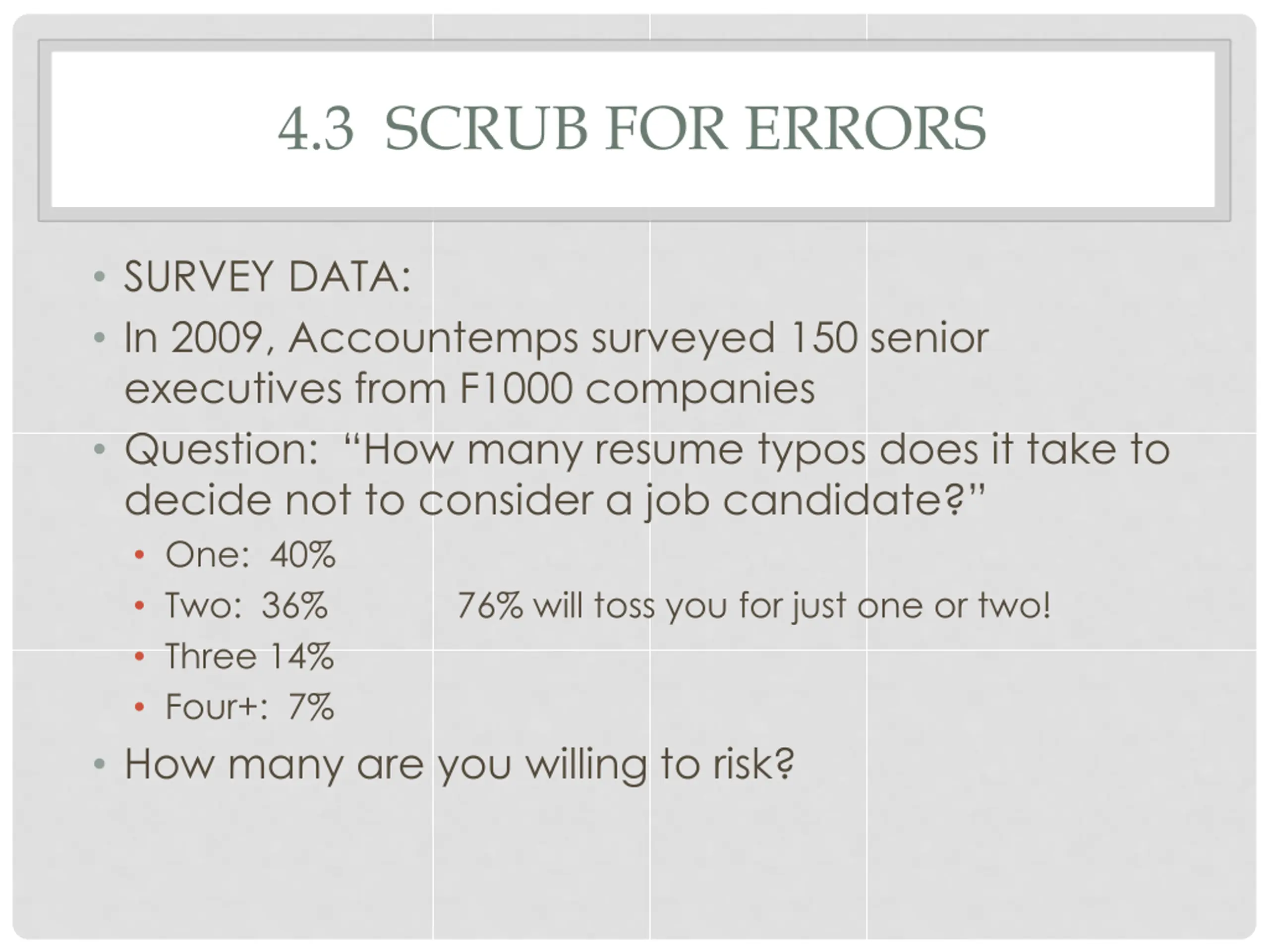 4.3 SCRUB FOR ERRORS SURVEY DATA: In 2009, Accountemps surveyed 150 senior executives from F1000 companies Question: How many resume typos does it take to decide not to consider a job candidate? One: 40% Two: 36% 76% will toss you for just one or two! Three 14% Four+: 7% How many are you willing to risk?