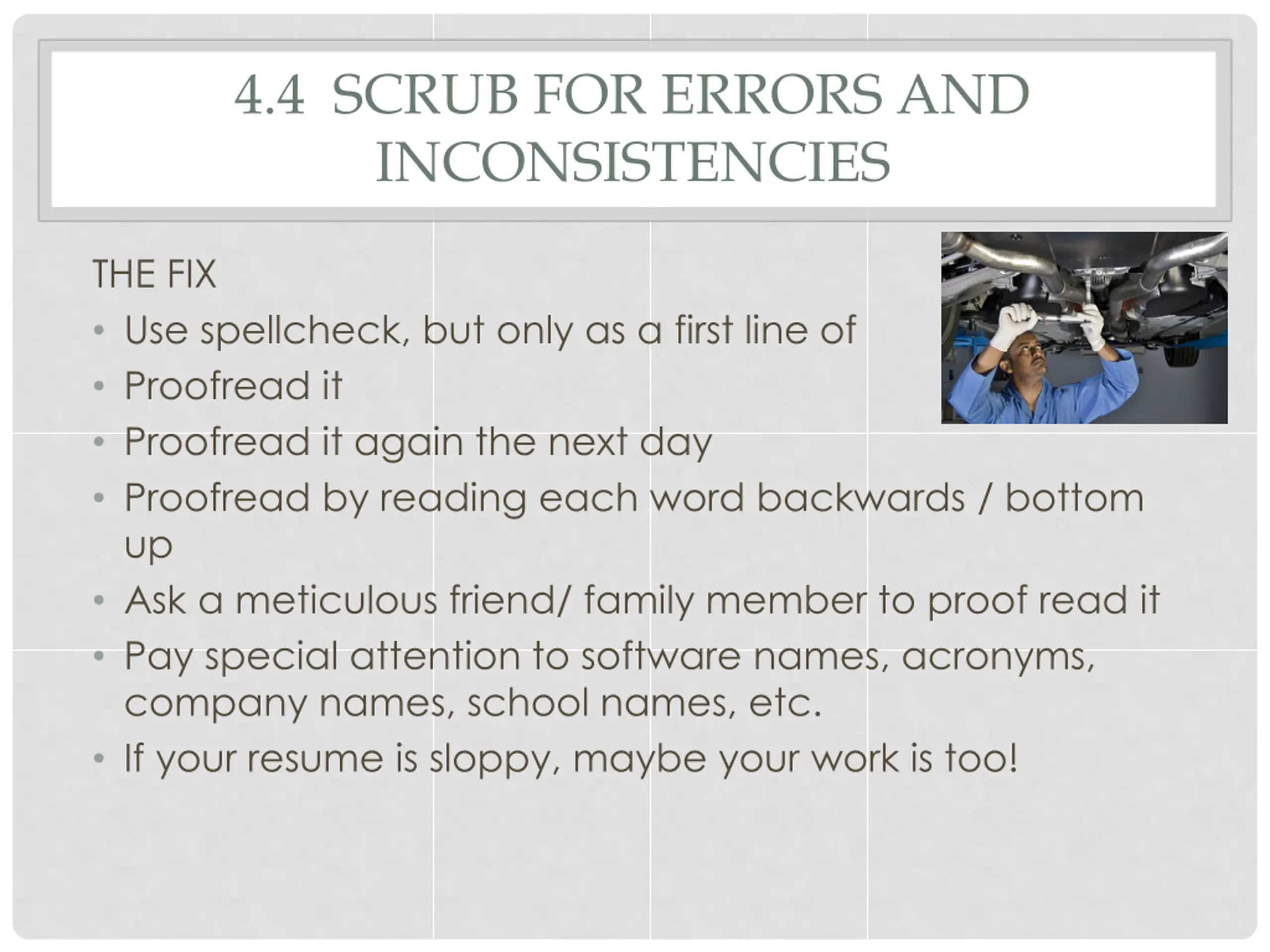 4.4 SCRUB FOR ERRORS AND INCONSISTENCIES THE FIX Use spellcheck, but only as a first line of defense Proofread it Proofread it again the next day Proofread by reading each word backwards / bottom up Ask a meticulous friend/ family member to proof read it Pay special attention to software names, acronyms, company names, school names, etc. If your resume is sloppy, maybe your work is too!