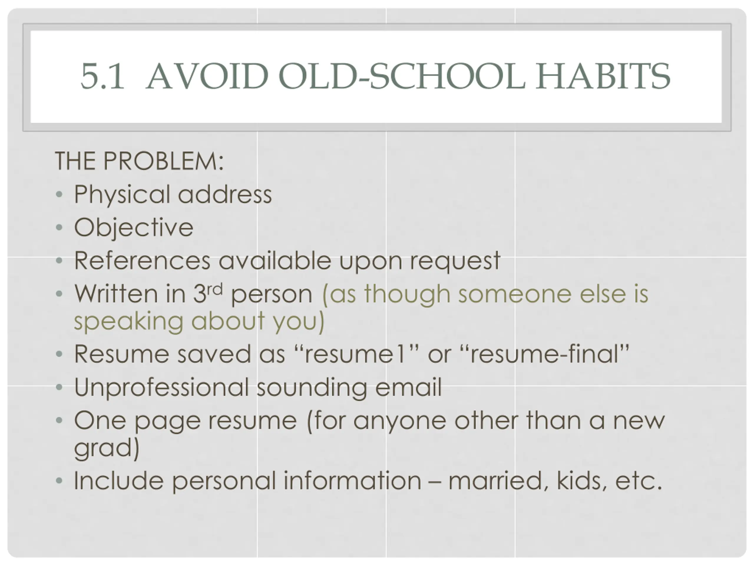 5.1 AVOID OLD-SCHOOL HABITS THE PROBLEM: Physical address Objective References available upon request Written in 3rd person (as though someone else is speaking about you) Resume saved as resume1 or resume-final Unprofessional sounding email One page resume (for anyone other than a new grad) Include personal information married, kids, etc.