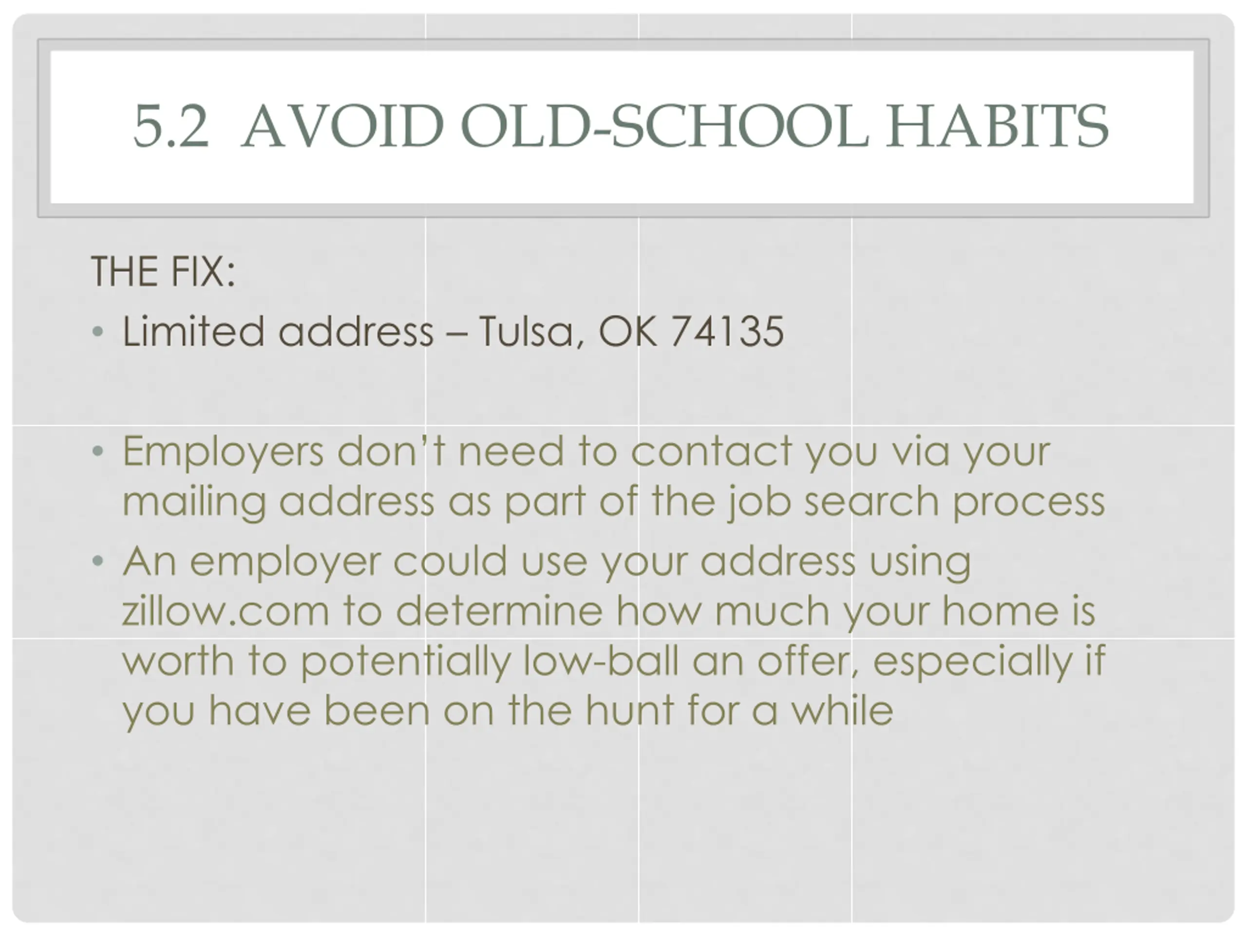 5.2 AVOID OLD-SCHOOL HABITS THE FIX: Limited address Tulsa, OK 74135 Employers don t need to contact you via your mailing address as part of the job search process An employer could use your address using zillow.com to determine how much your home is worth to potentially low-ball an offer, especially if you have been on the hunt for a while