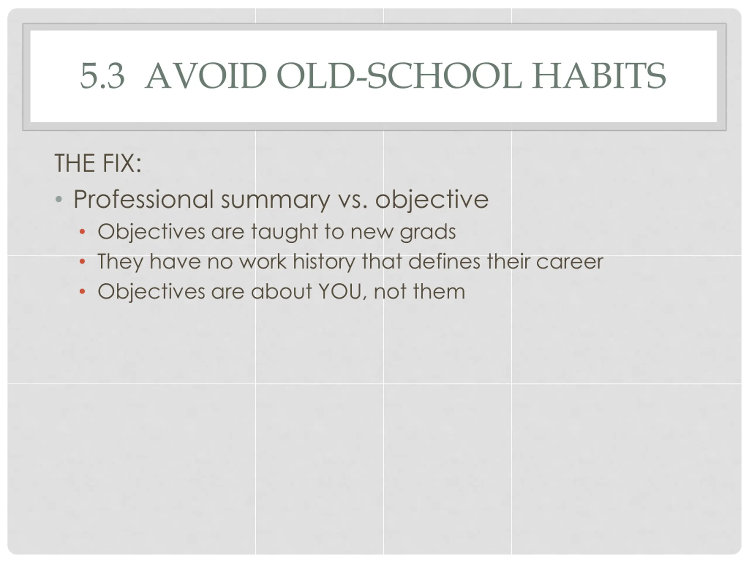5.3 AVOID OLD-SCHOOL HABITS THE FIX: Professional summary vs. objective Objectives are taught to new grads They have no work history that defines their career Objectives are about YOU, not them