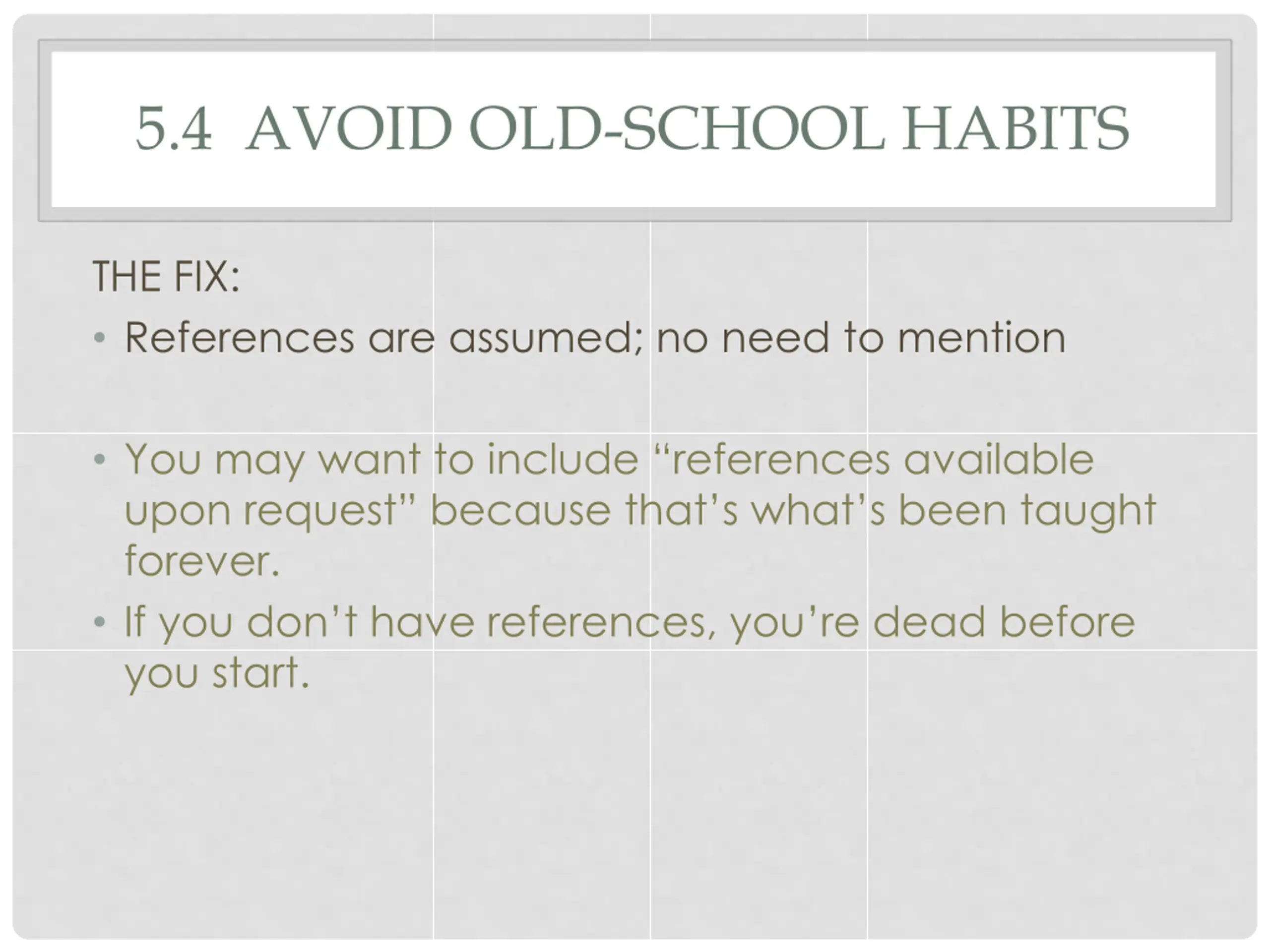 5.4 AVOID OLD-SCHOOL HABITS THE FIX: References are assumed; no need to mention You may want to include references available upon request because that s what s been taught forever. If you don t have references, you re dead before you start.