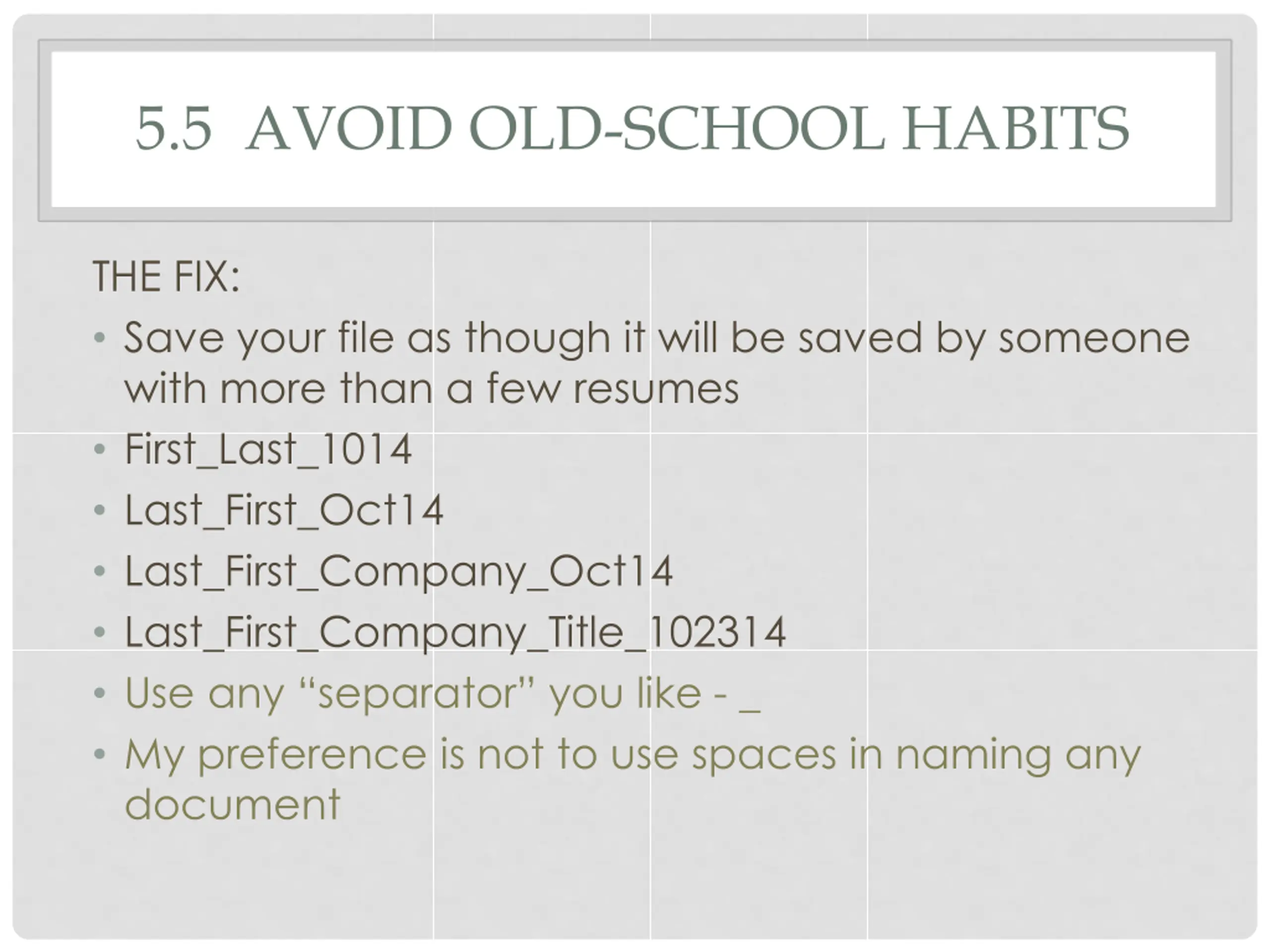 5.5 AVOID OLD-SCHOOL HABITS THE FIX: Save your file as though it will be saved by someone with more than a few resumes First_Last_1014 Last_First_Oct14 Last_First_Company_Oct14 Last_First_Company_Title_102314 Use any separator you like - _ My preference is not to use spaces in naming any document