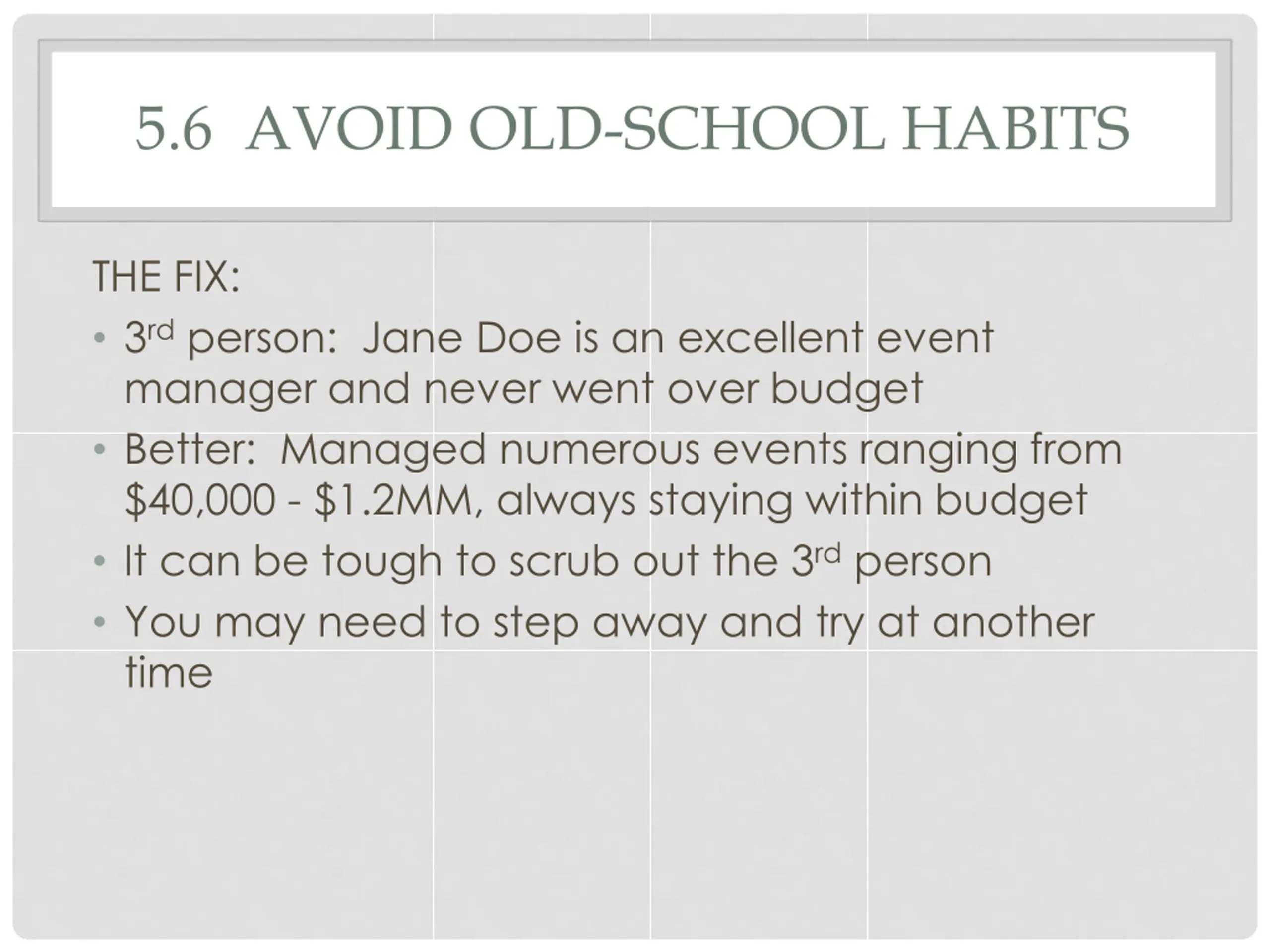 5.6 AVOID OLD-SCHOOL HABITS THE FIX: 3rd person: Jane Doe is an excellent event manager and never went over budget Better: Managed numerous events ranging from $40,000 - $1.2MM, always staying within budget It can be tough to scrub out the 3rd person You may need to step away and try at another time
