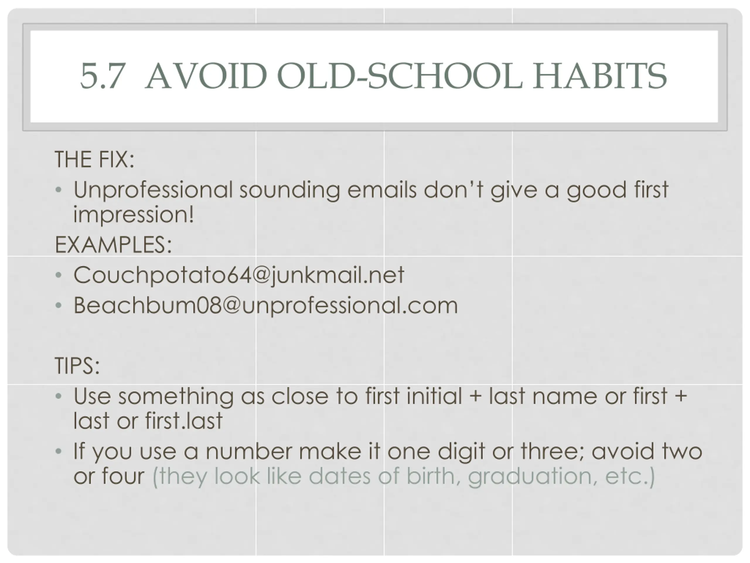 5.7 AVOID OLD-SCHOOL HABITS THE FIX: Unprofessional sounding emails don t give a good first impression! EXAMPLES: Couchpotato64@junkmail.net Beachbum08@unprofessional.com TIPS: Use something as close to first initial + last name or first + last or first.last If you use a number make it one digit or three; avoid two or four (they look like dates of birth, graduation, etc.)