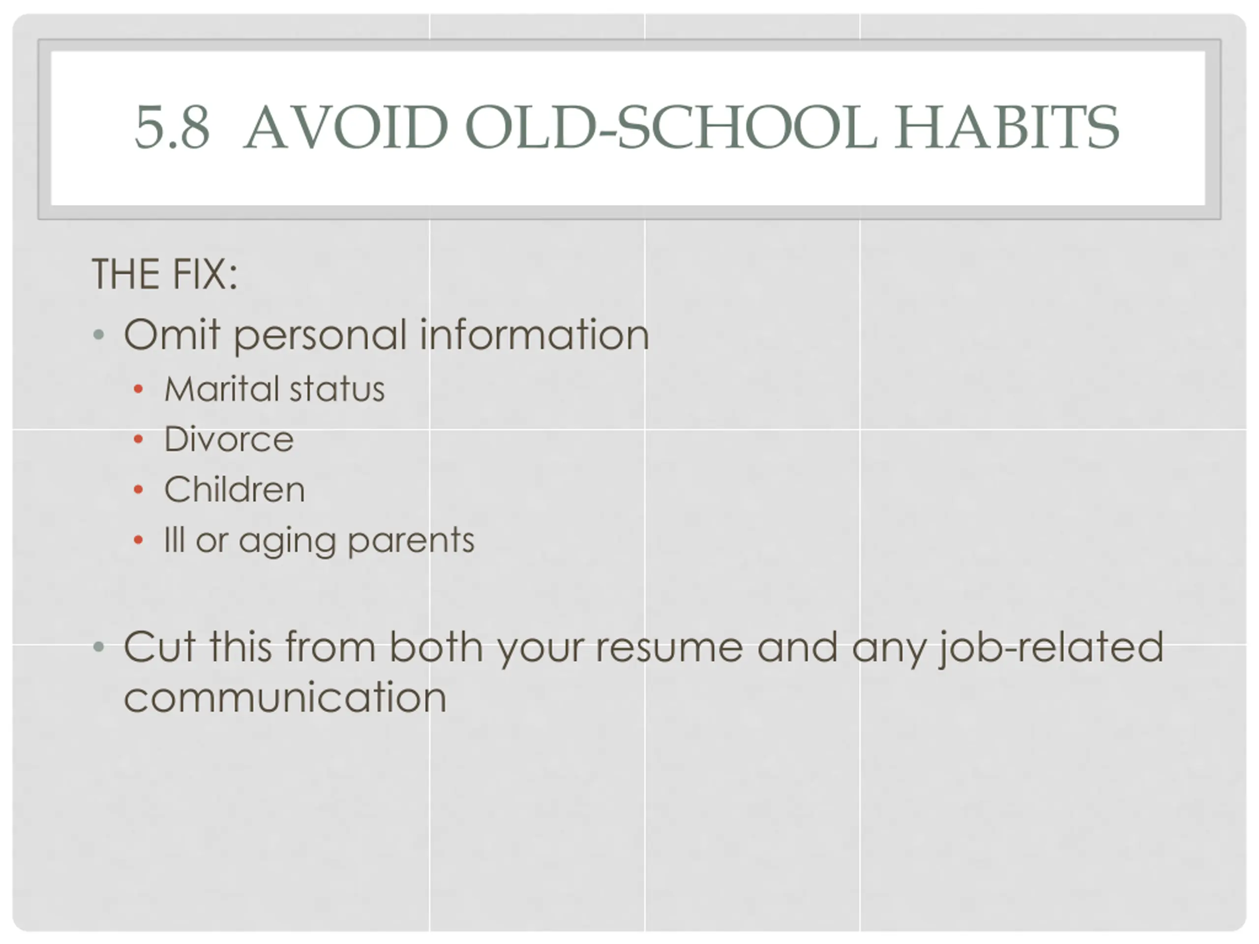 5.8 AVOID OLD-SCHOOL HABITS THE FIX: Omit personal information Marital status Divorce Children Ill or aging parents Cut this from both your resume and any job-related communication
